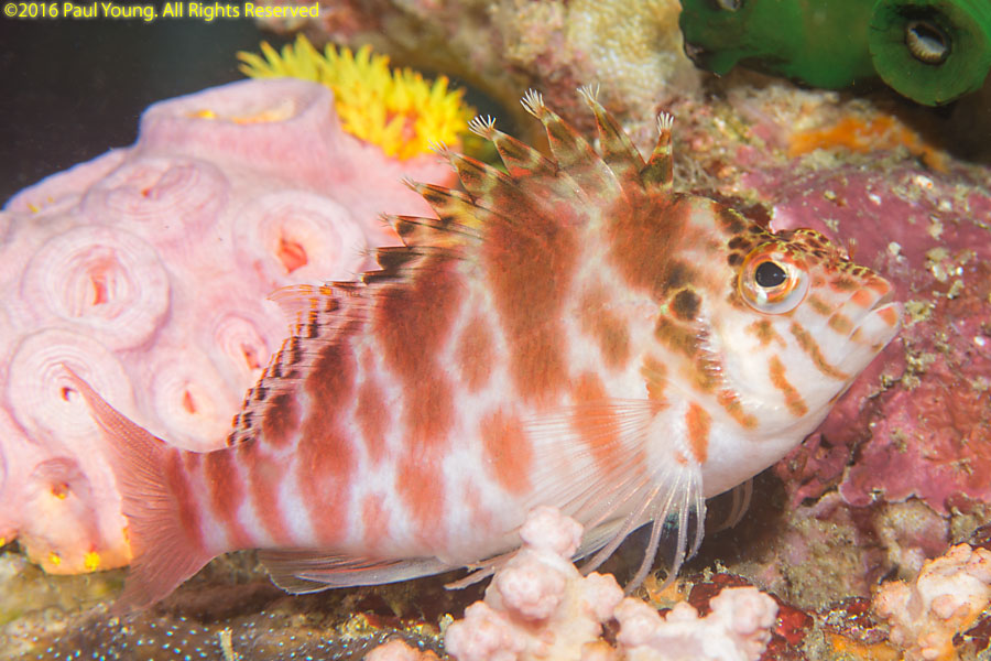 Hawfish have large heads and merged dorsal fins, the first consisting of ten connected spines. At the tip of each spine are several trailing filaments.