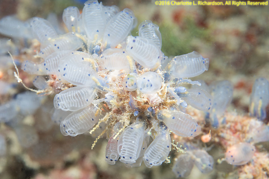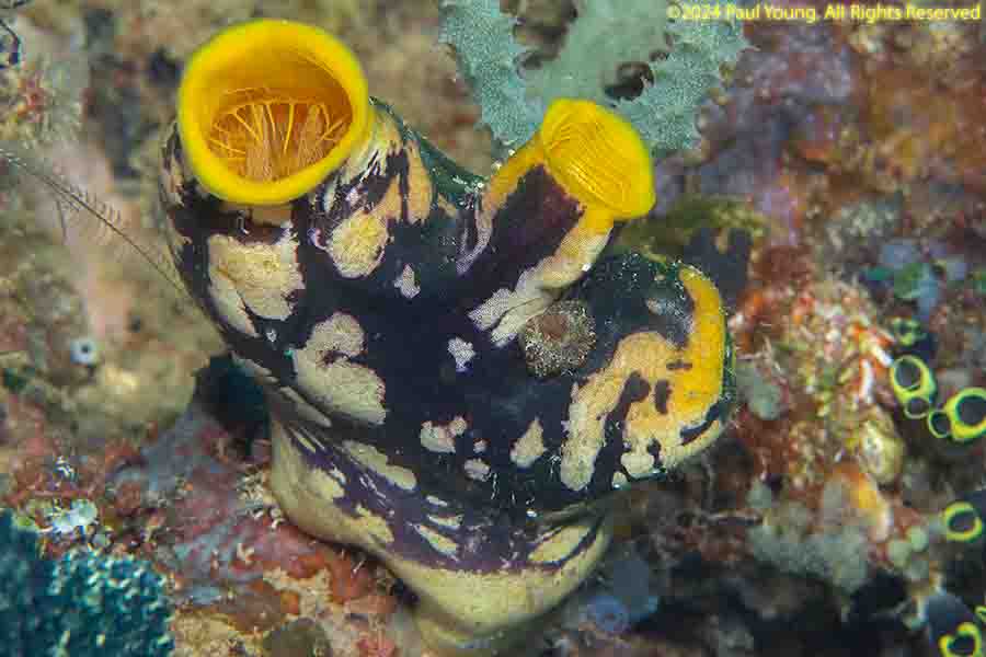 Tunicates (ascidians) or sea squirts have a tough outer "tunic" made of polysaccheride cellulose. In some colonial species the tunics of adjacent animals are fused. They feed by taking in water through the oral syphon. After flushing through the mucus-covered gill slits the water exits through the atrial syphon.