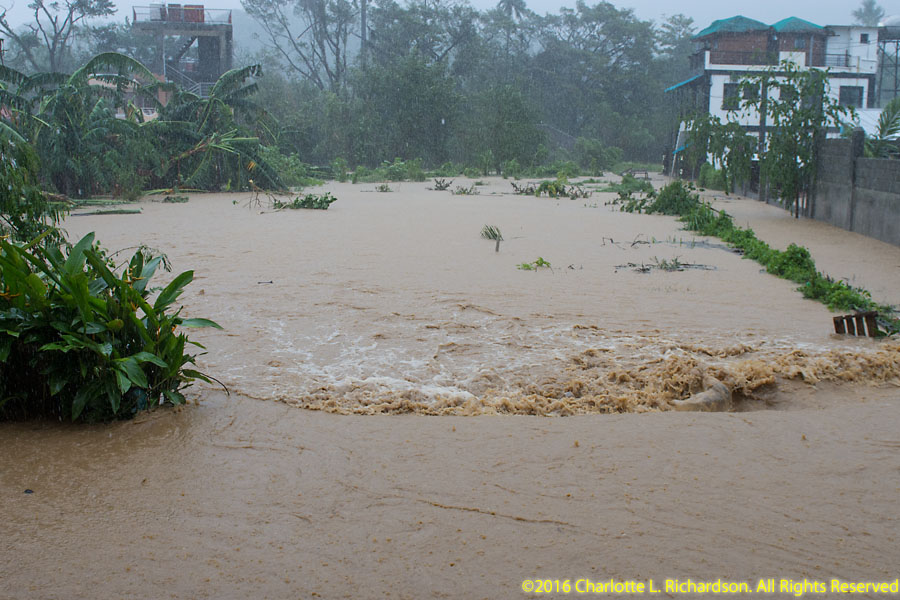 The eye of the storm passed directly over Batangas on December 26th. The back side of the storm, as it passed to our west, was much windier than the first half. The storm cost us two days of diving in Puerto Galera. During the height of the storm, the street in front of the hotel was knee-deep in water, and the swimming pool was overflowing into the first-floor rooms (including ours). Power was shut off in Puerto Galera, but the hotel generator stayed up, and even (most of the time) the internet connection. A huge pile of towels and bathmats kept most of the water out of our room, where we had piled everything on top of the beds to keep it (mostly) dry.