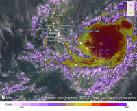 The Philippines Coast Guard stopped all boat traffic on Christmas Day in advance of the storm. All ships headed for the harbors-of-refuge. The resort's large dive boat, the "Big Beth" is in the harbor-of-refuge behind Sand Bar, with the smaller "Lady Merci" hidden behind it. The various beach toys from White Beach were also in the small boat harbor. Larger ships and container ships were in the outer harbor.