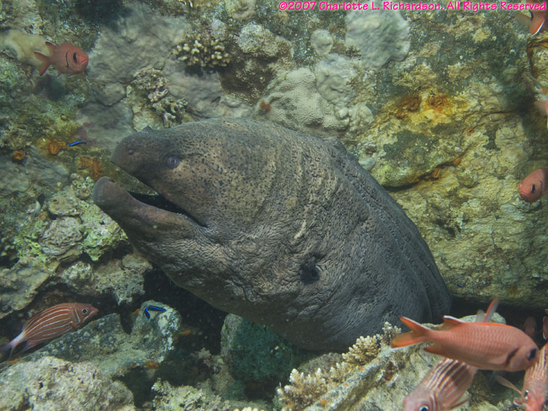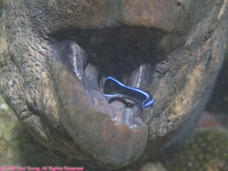 Giant moray, Gymnothorax javanicus, with common cleaner wrasse, Labroides dimidiatus