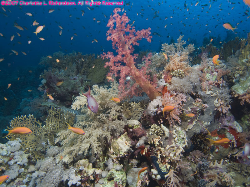 Shark and Jolande Reefs lie at the southern tip of Ras Mohammed. The north-south current takes you from Shark Reef to Jolande Reef. The Jolande was a Cypriot freighter that sank here on April 1, 1980. Most of the wreck washed off the reef into deep (530') water in a heavy storm in 1987, but her cargo of bathtubs and ceramic toilets remains on the reef from 50' to 80'.