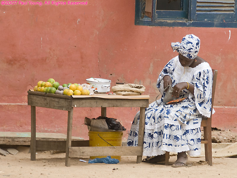 Traditional musicians, one playing a 21-string kora, a cross between a harp and a lute. The belly of the Kora is a large gourd (calabash) and the head is cowhide.