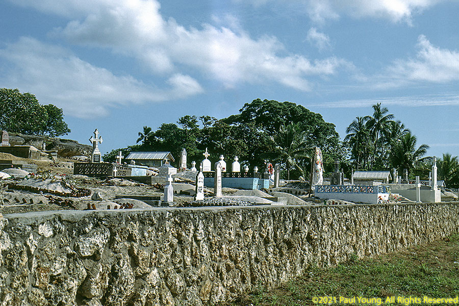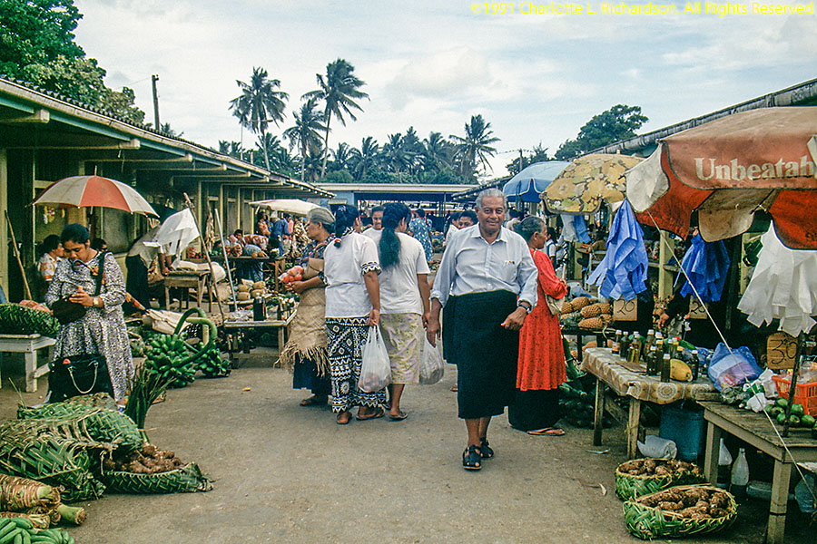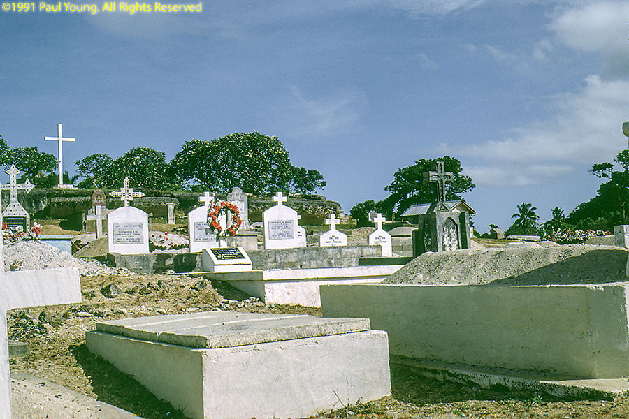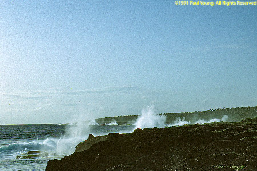 The main island is Tongatapu. The whole island is an uplifted block of coral limestone no more than 30' above sea level anywhere which tilts into the sea at the northern coast. Most of the island is covered with coconut-palm plantations. We visited Tonga in 1991, staying on Tongatapu.