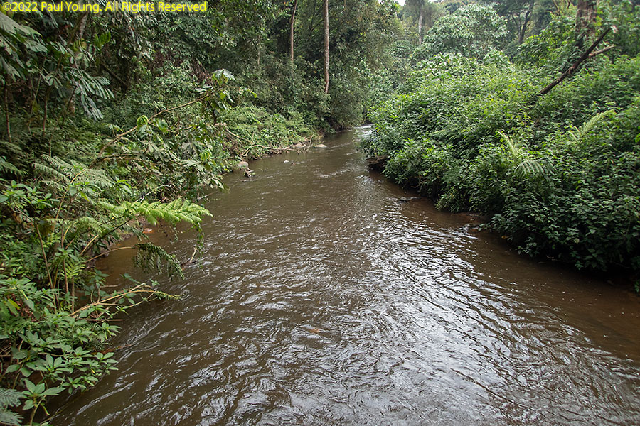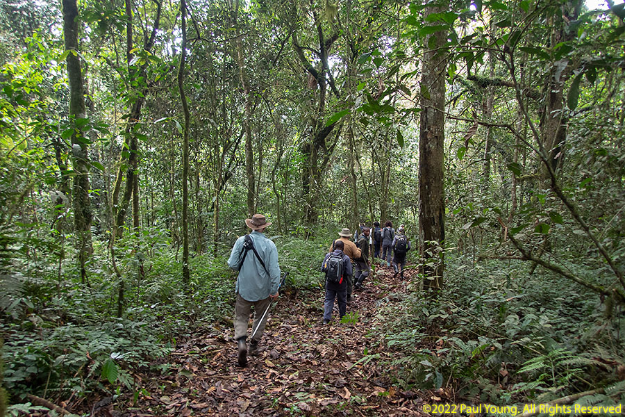 Bwindi Impenetrable National Park in southwest Uganda protects a rugged forested landscape at elevations of 3,904 to 8,553 ft, home to mountain gorillas, 45% of their total population. It lies on the edge of the Albertine Rift. It is a habitat for 120 species of mammals, more than any Ugandan national park other than Queen Elizabeth, ten other primate species besides the mountain gorillas (Gorilla beringei beringei), six antelope species, 350 birds of which 23 are endemic to the Albertine Rift and 14 of which are found only in Bwindi, 220 butterflies including eight endemics, 27 frogs, 160 trees, 100 ferns, and more than a thousand species of flowering plants.