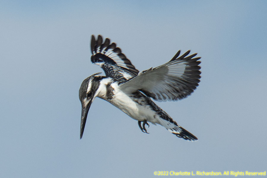 Pied kingfisher, Ceryle rudis, in flight, perching male (left) and female (right)