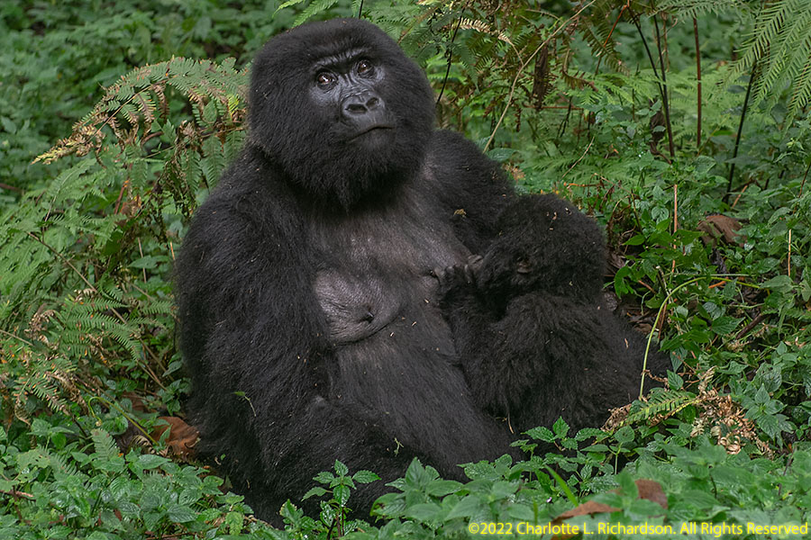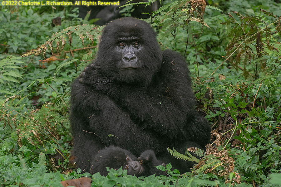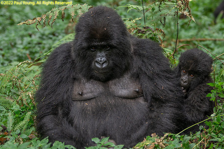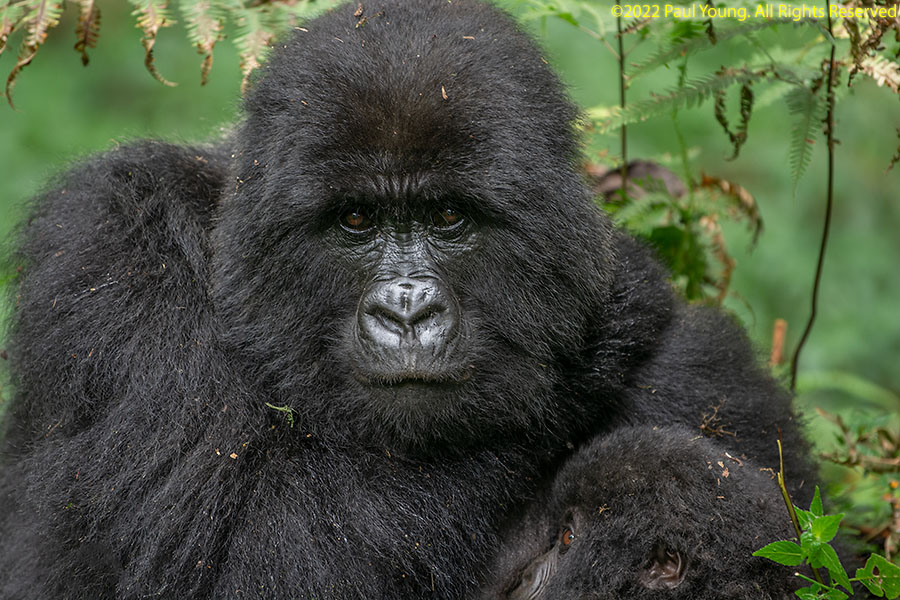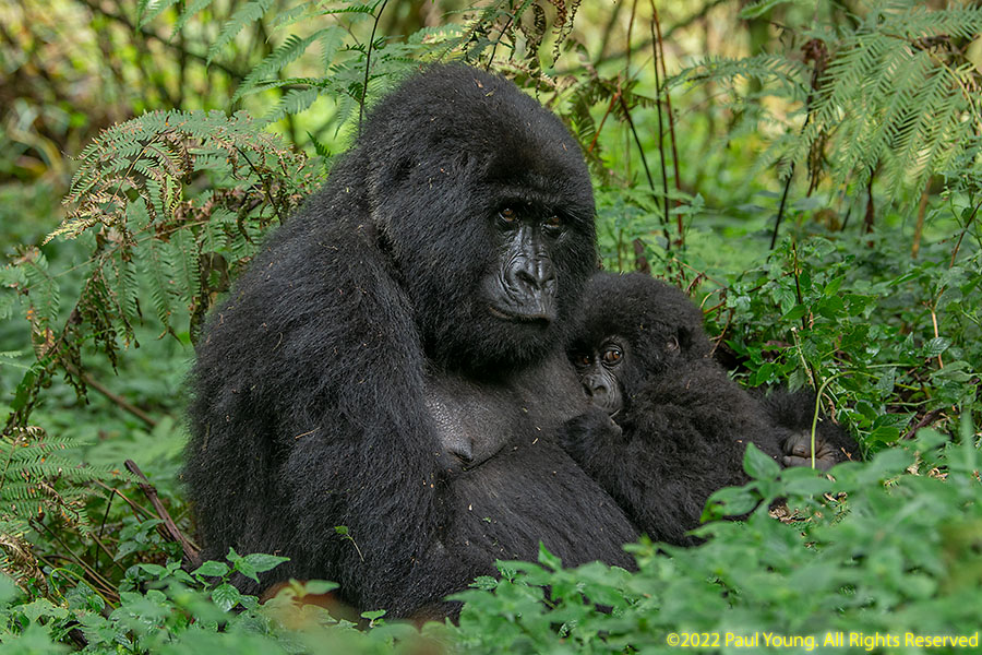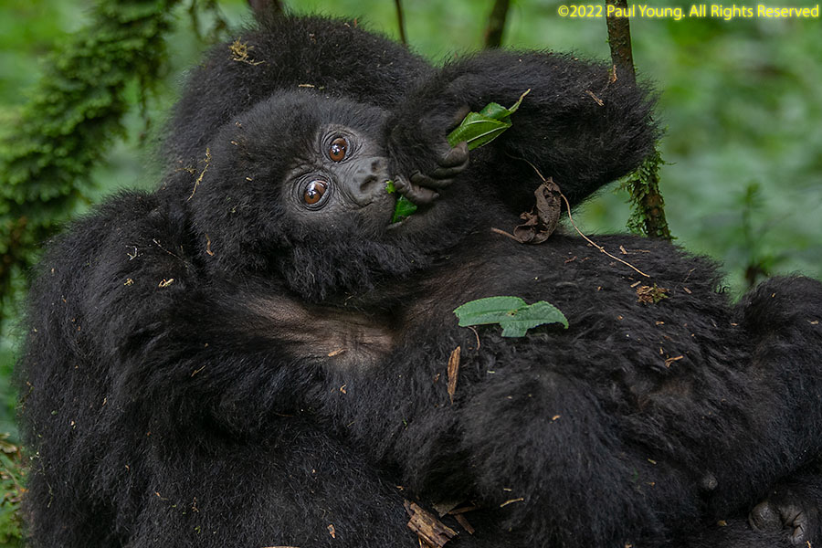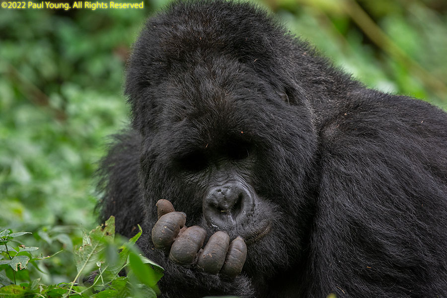 Mgahinga Gorilla National Park, Uganda's smallest park at the southwest tip of the country near Kisoro, protects mountain gorillas, Gorilla beringei beringei, and the endemic, endangered, bamboo-eating golden monkey (Cercopithecus kandti).