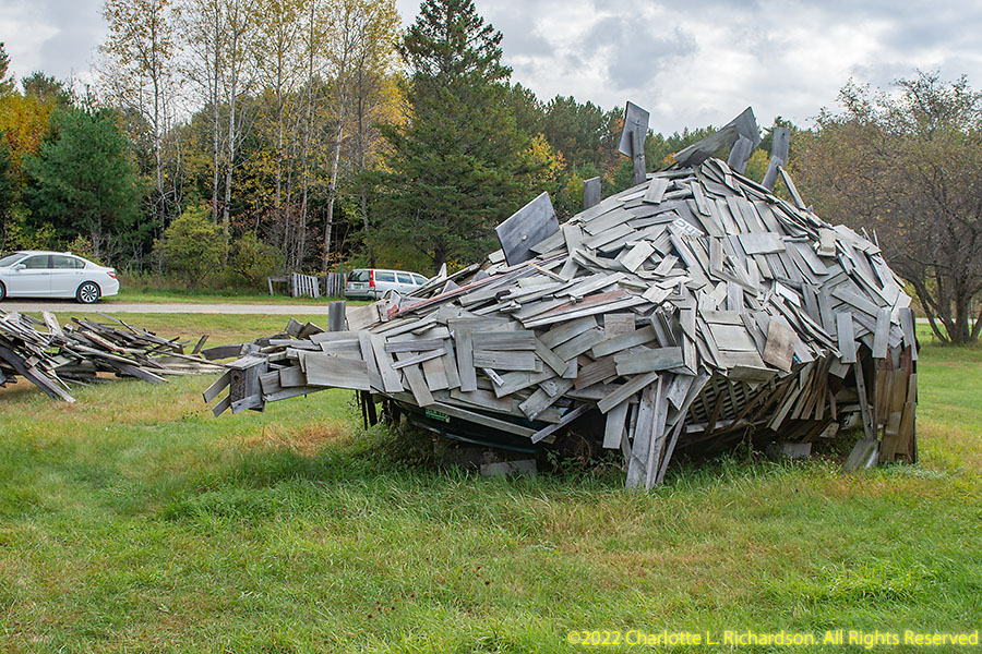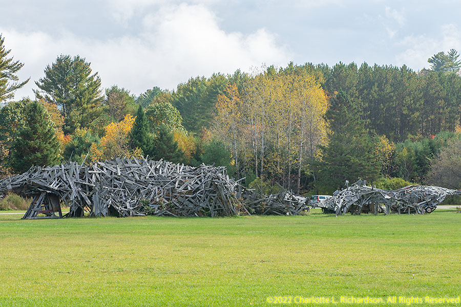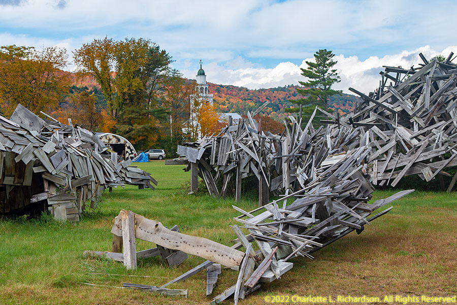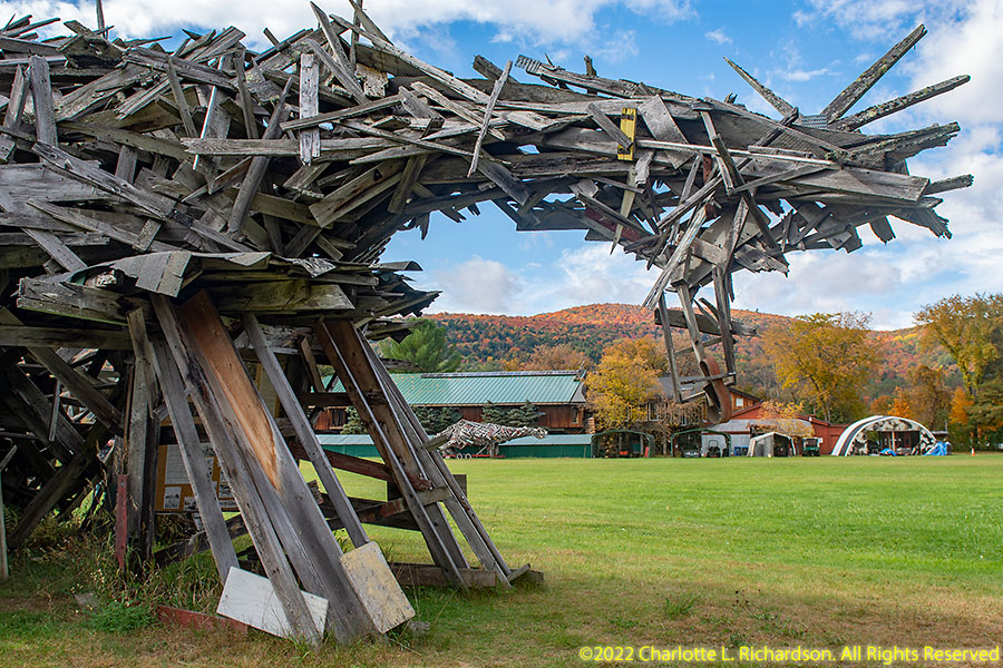 Scrap wood sculptures of fanciful dinosaur-like figures at this quiet grass landing strip, which is home to a soaring club. The Vermontosaurus was the creation of Brian Boland, owner of the Post Mills Airport (2B9), using scrap lumber from a collapsed portion of his private museum and hot-air balloon manufacturing facility. Boland died in a balloon accident on July 15, 2021.