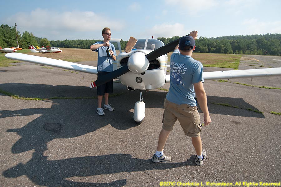 As a new student pilot, Charlotte flew to Oshkosh for Airventure 2010 with Devan Wiebe and Troy DiGiovanni in their Piper Cherokee, while Paul took a commercial flight with most of the luggage. Our route west from 3B3 took us over Niagara Falls. We ended up overnighting in Lansing, Michigan, due to thunderstorms, and flew into Fond du Lac the next morning. Later in the week the boys moved the plane to Oshkosh.