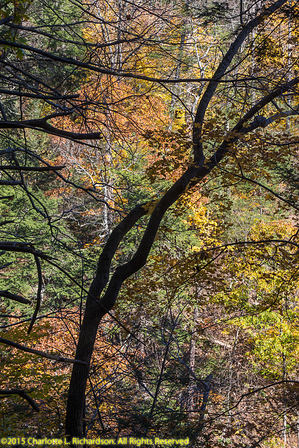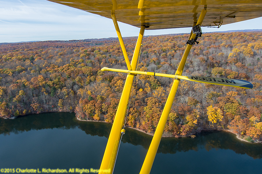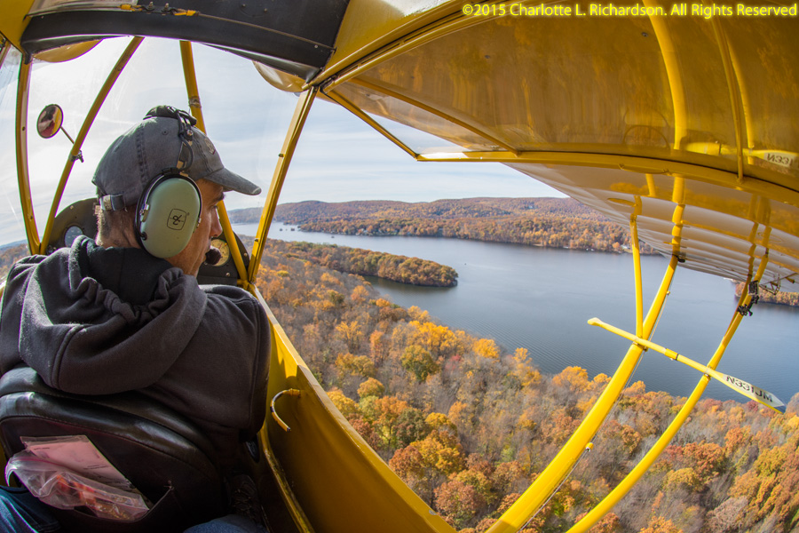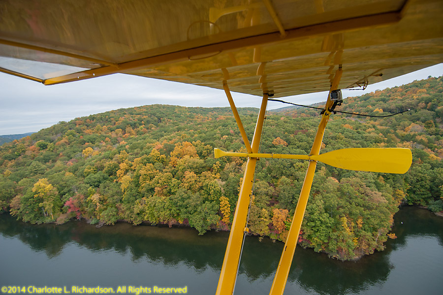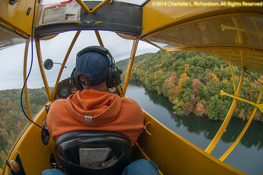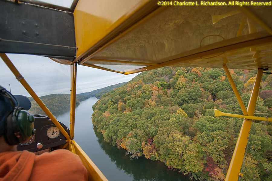 Another visit to fly this Cub on Halloween 2015. The wind was almost dead-calm, so a lot of this flight was glassy-water takeoffs and landings. I had a camera along myself this time and could shoot photographs while Tony handled the Cub. The foliage this late in the season was mostly oaks. After the flight and lunch, Paul and I took a walk around Lovers Leap State Park to photograph the same area from ground level that I had photographed from the air.