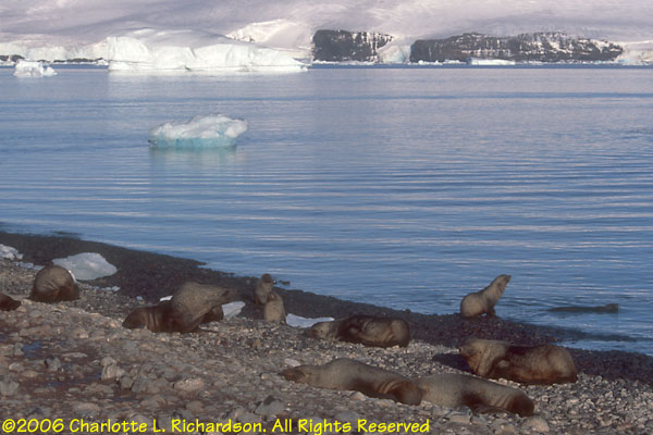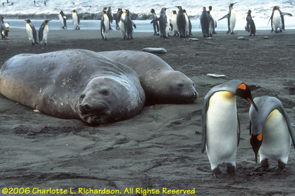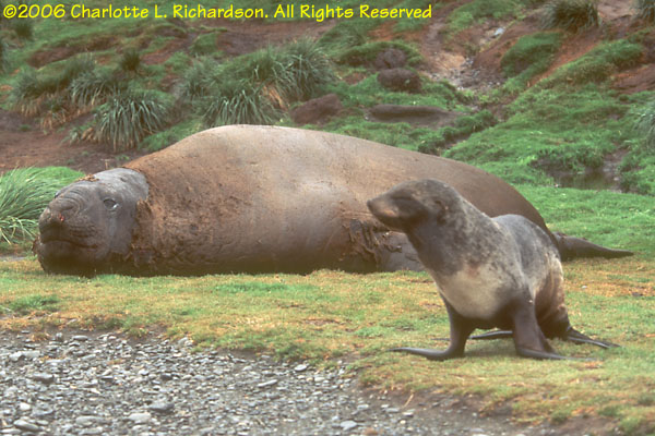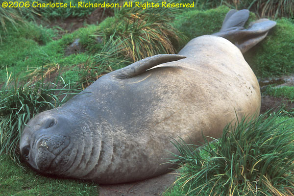 The elephant seal is the largest of all pinnipeds. Full-grown males can be more than 4 meters long. Sleepy and awkward on land, they look funny when molting, which they do in February. When not breeding or molting, they live in the open sea.