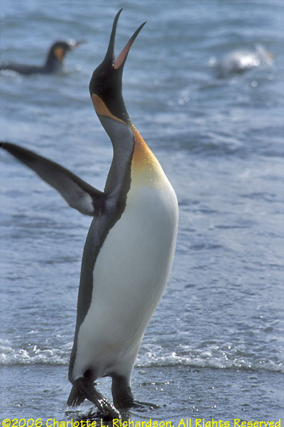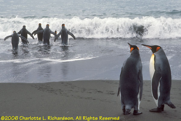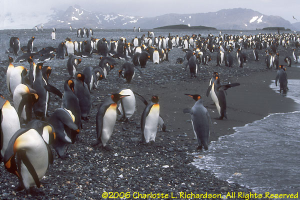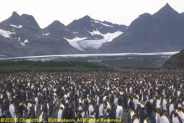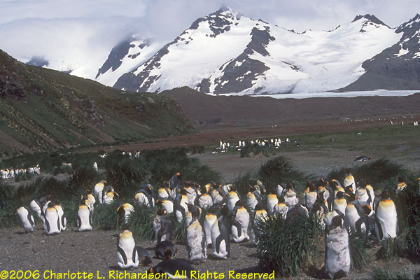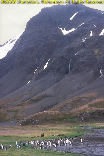 This glacial plain is amazing, a huge king penguin colony! A hundred thousand pairs of adult birds, with eggs, new chicks, and older chicks make this a fantastic place. There are fur seals here as well. And where there are penguins, there are skuas. The plain faces due north on the Bay of Isles and is backed by the Grace and Lucas Glaciers.