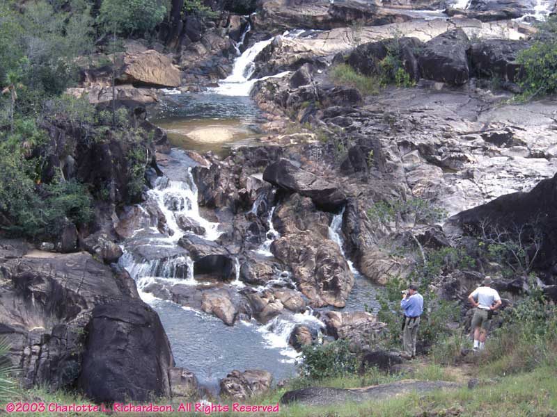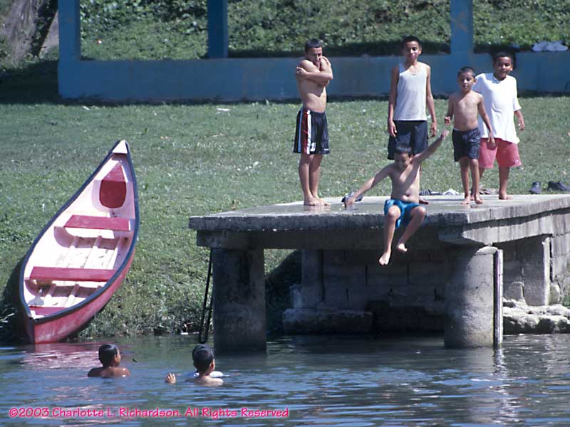 This is where we stayed for most of our land touring, including Caracol, Xunantunich, Chechem Ha, Tikal, and the places on this page. The photos show our cabin, the dining room, and some local children playing in the river.