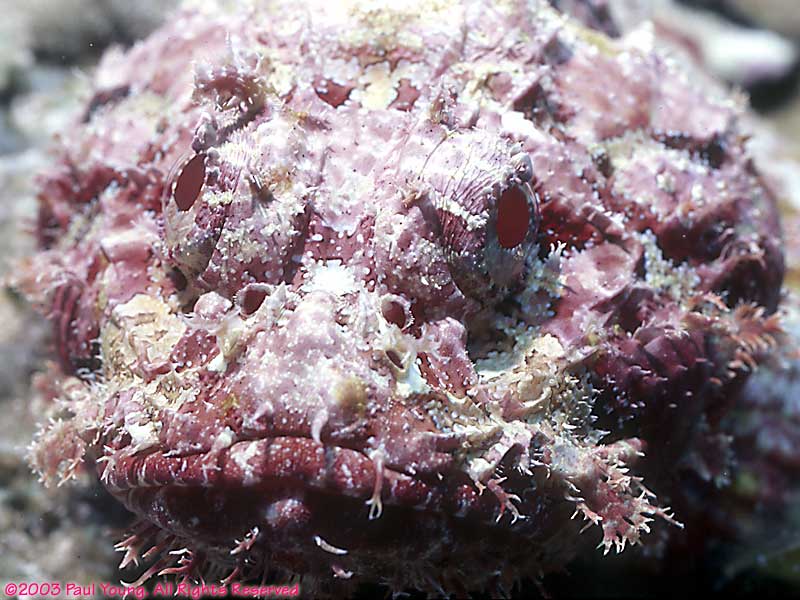 Scorpionfish sit on the bottom and try to look like coral or sponges. When an unsuspecting small fish wanders by they quickly open their mouth and gulp it.