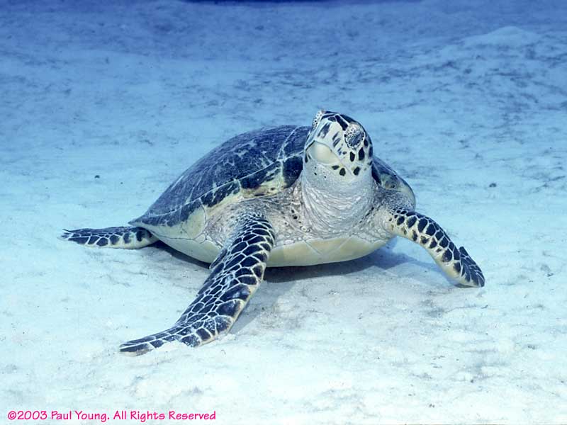 Turtles:The turtle on the left is a Green turtle, Chelonia mydas, and the one on the right is a Hawksbill, Eretmochelys imbricata. They live in the water all the time, coming on land only to lay eggs. They breathe air so they must swim to the surface occasionally.