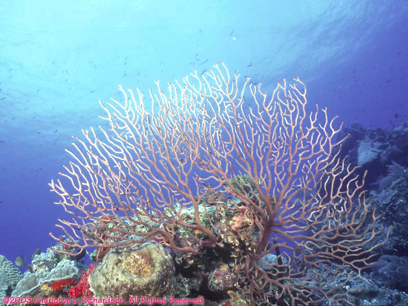 Fan Blue HoleWe dove the blue hole at Lighthouse Reef. At about 100 feet, or 30 meters, there are big stalactites from when this was above water. Now they are covered with marine growth.