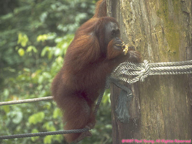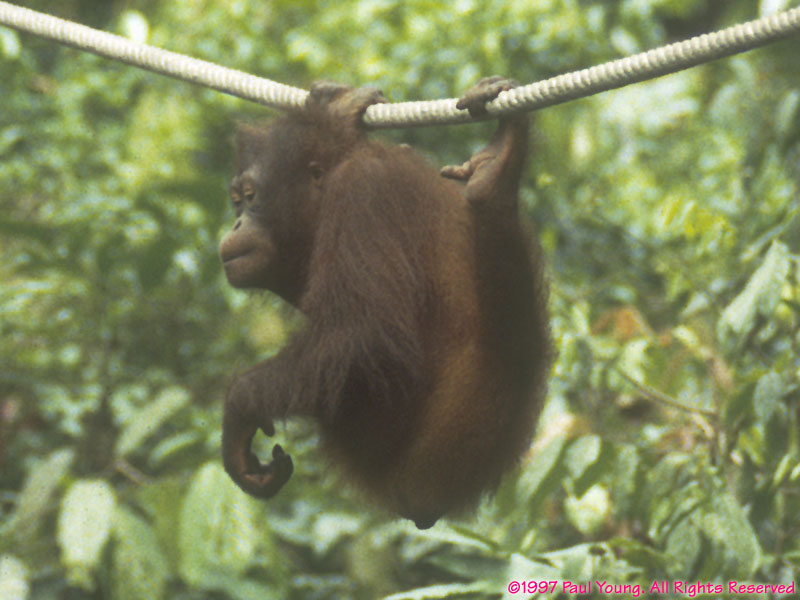 Sepilok Orangutan Sanctuary houses former pets and orphaned infant Bornean orangutans, Pongo pygmaeus, being returned to the wild.
