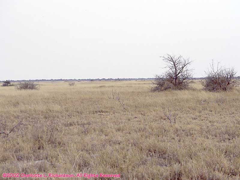 The Kalahari Desert during the dry winter season is a vast flat wasteland of salt pans and dry grasslands.