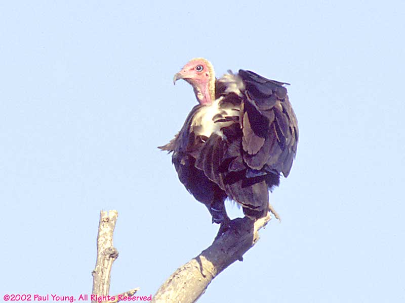 The white-backed vulture on the right is sharing a perch with an immature hooded vulture.