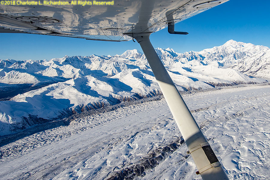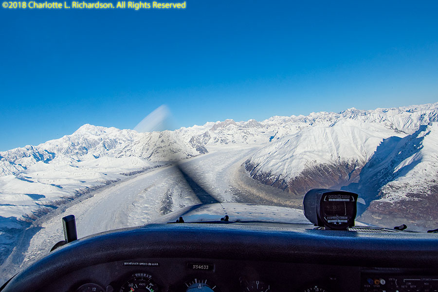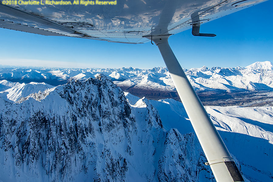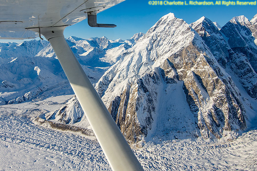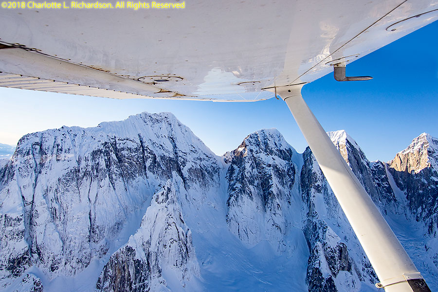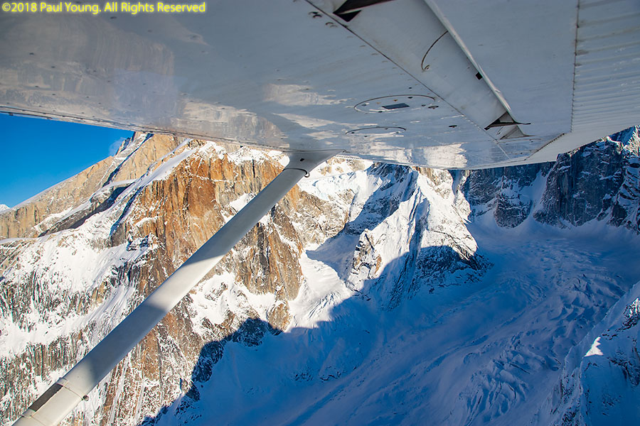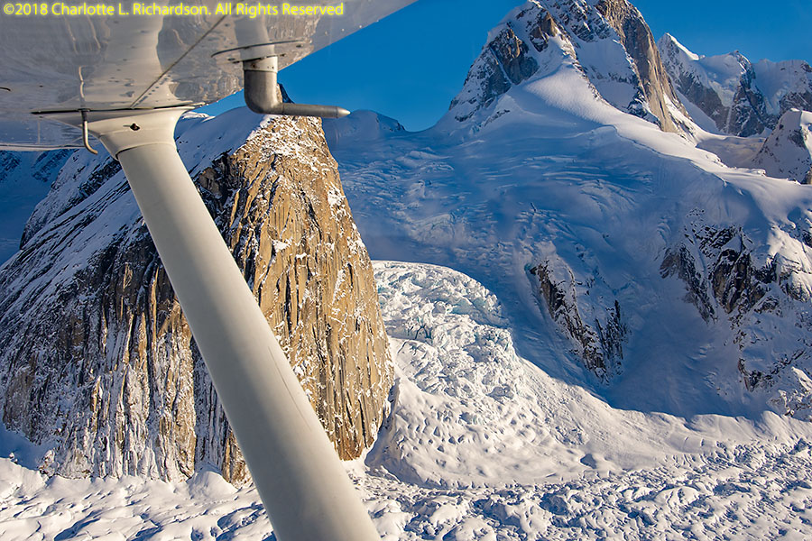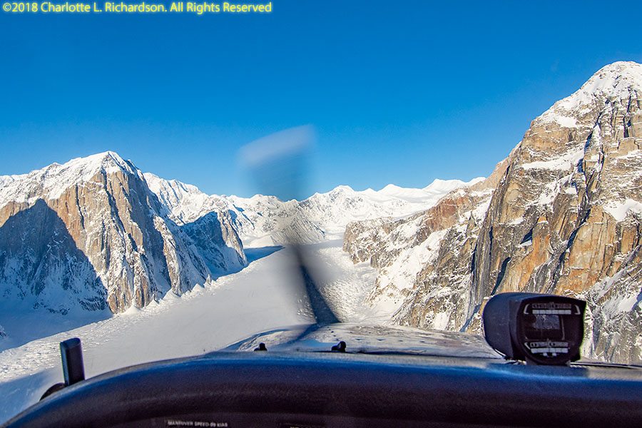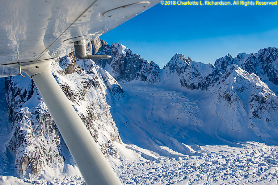 Flying the Ruth Glacier Great Gorge on Denali. I rented a Cessna 172 from Legends Aviation in Willow, and flew once again with Walt Warner. Our route took us over the foothills of the Alaska Range at 6500'. We intercepted the outflow of the Ruth Glacier and flew up into Denali, up the Great Gorge. Only two other aircraft were on the route. Another fixed-wing aircraft was behind me, and a red helicopter started up the gorge as I was coming out. Visibility was unlimited.