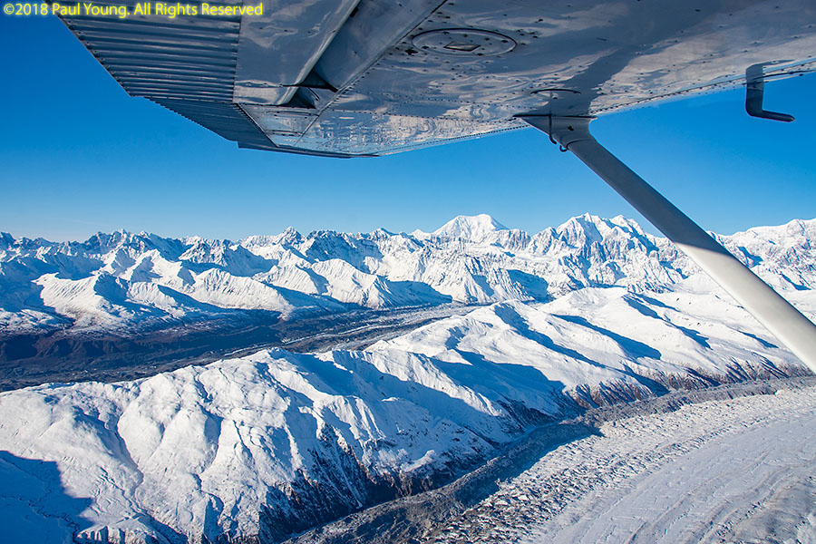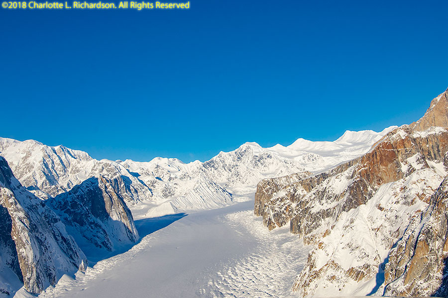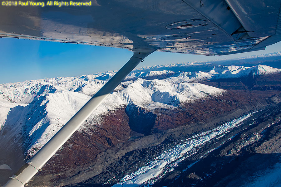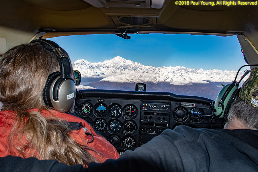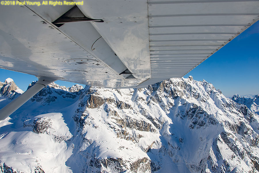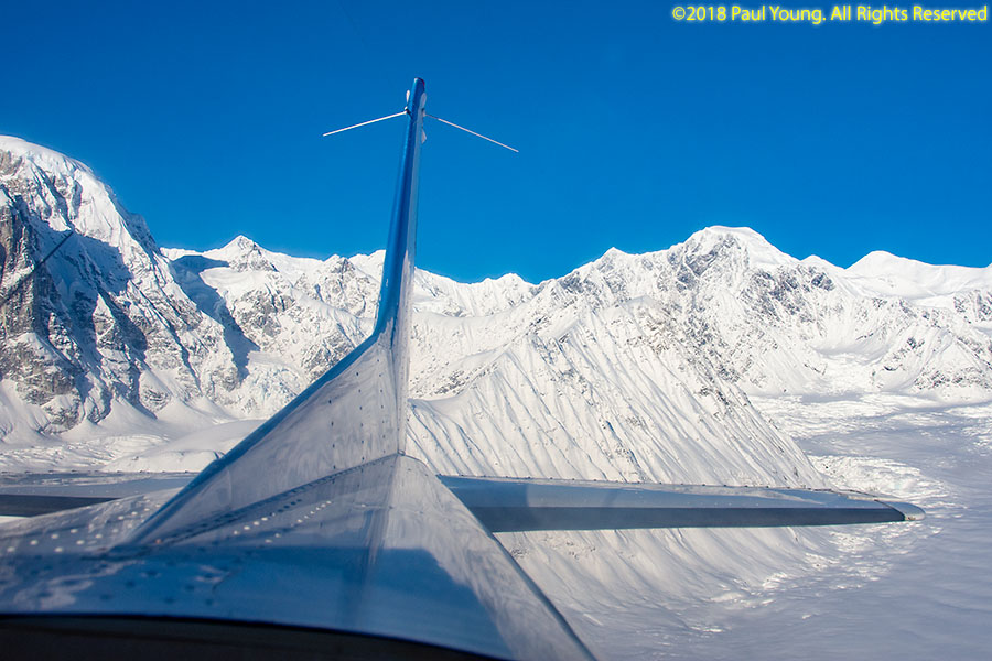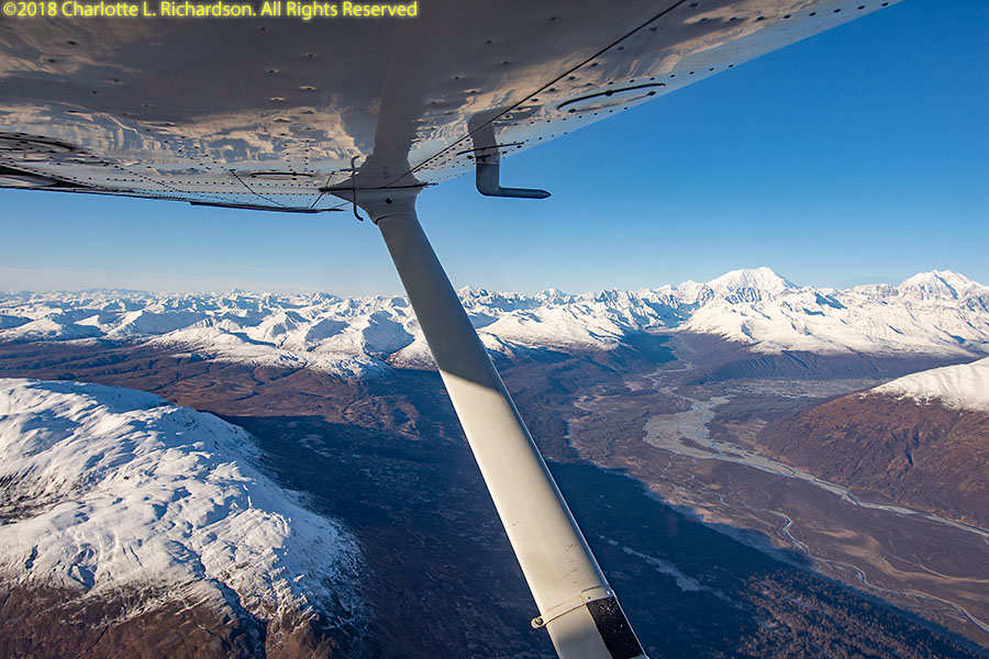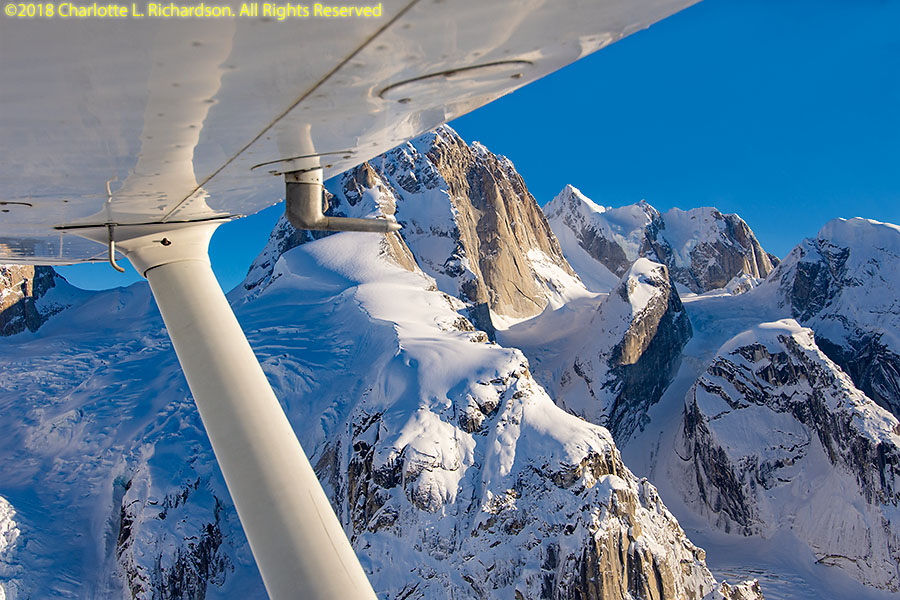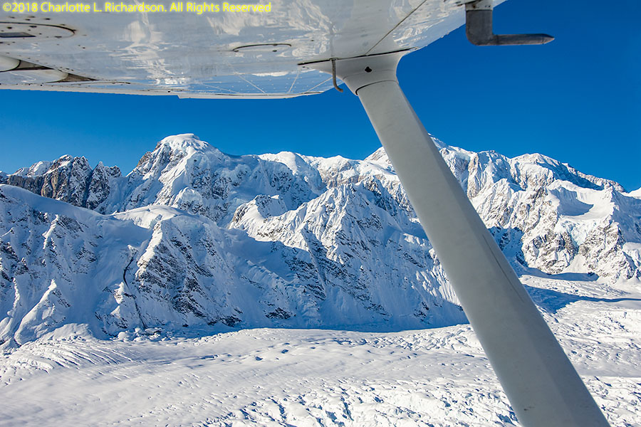 Flying the Ruth Glacier Great Gorge on Denali. I rented a Cessna 172 from Legends Aviation in Willow, and flew once again with Walt Warner. Our route took us over the foothills of the Alaska Range at 6500'. We intercepted the outflow of the Ruth Glacier and flew up into Denali, up the Great Gorge. Only two other aircraft were on the route. Another fixed-wing aircraft was behind me, and a red helicopter started up the gorge as I was coming out. Visibility was unlimited.