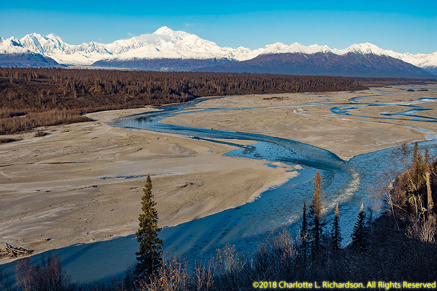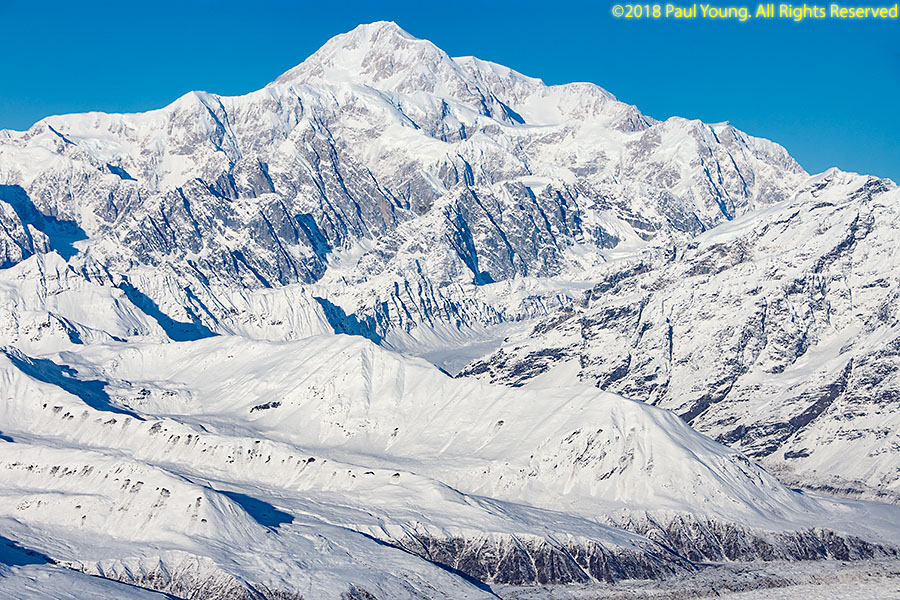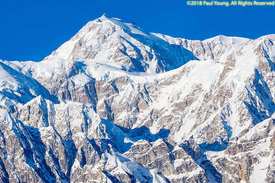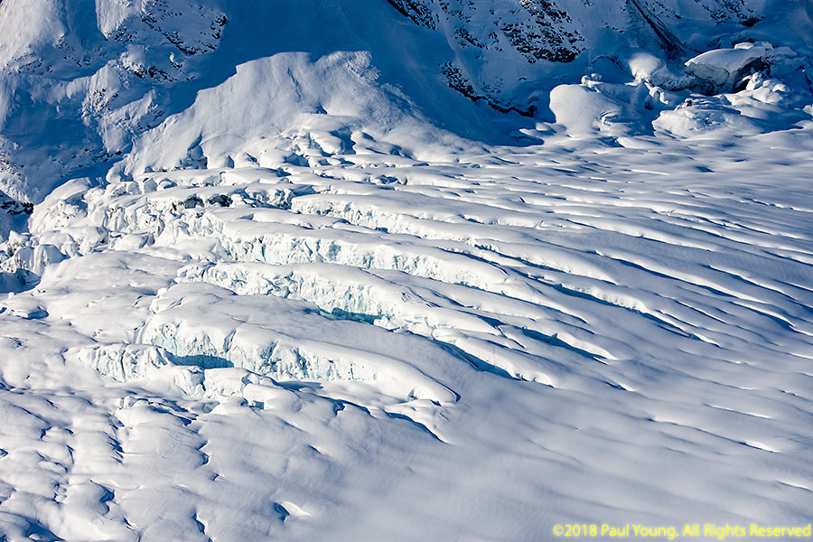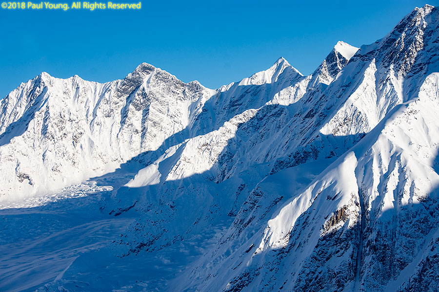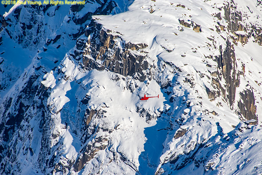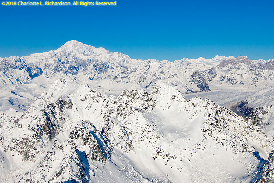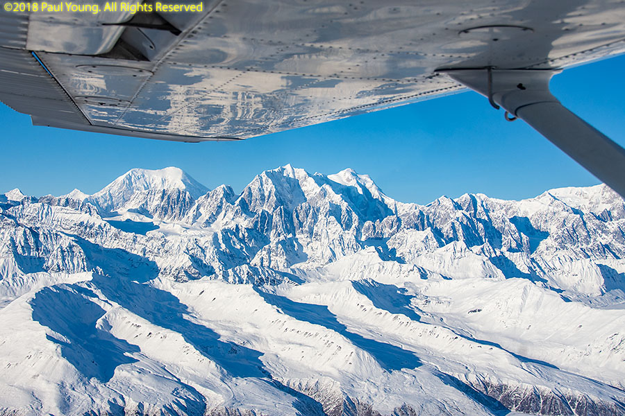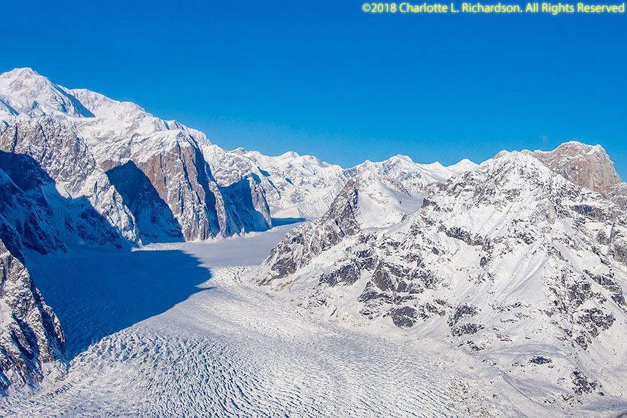 Flying the Ruth Glacier Great Gorge on Denali. I rented a Cessna 172 from Legends Aviation in Willow, and flew once again with Walt Warner. Our route took us over the foothills of the Alaska Range at 6500'. We intercepted the outflow of the Ruth Glacier and flew up into Denali, up the Great Gorge. Only two other aircraft were on the route. Another fixed-wing aircraft was behind me, and a red helicopter started up the gorge as I was coming out. Visibility was unlimited.