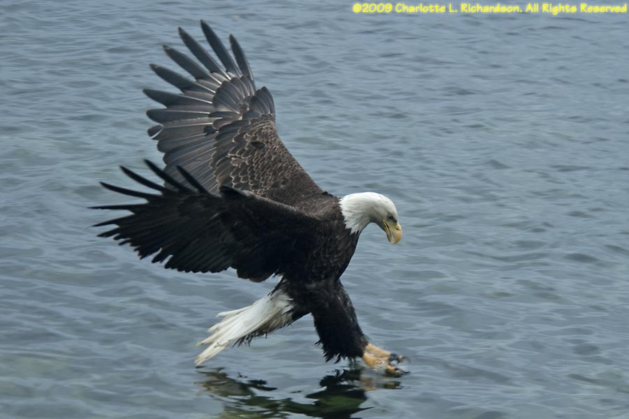 When a fishing bald eagle spots likely prey, the bird dips one wing and swoops down to the water with its legs extended. As it approaches the fish, the eagle extends its legs in front of its body and makes a rapid backward sweep to grab the prey in its talons. Eagles have semi-transparent protective eyelids that can be closed when grabbing prey. Usually the birds will land before consuming their fish, but they can eat while flying. Other eagles may try to steal the prey, either while the successful bird is flying away with its catch or after it has landed.