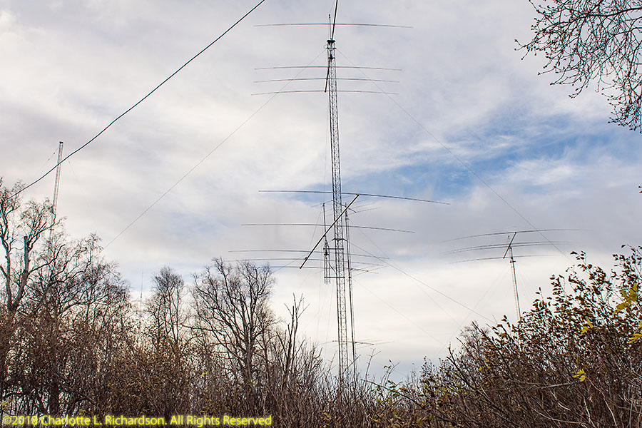 160m: Full-sized vertical built of Rohn 25 with a whisker on top and ground radials. Used for transmit only.