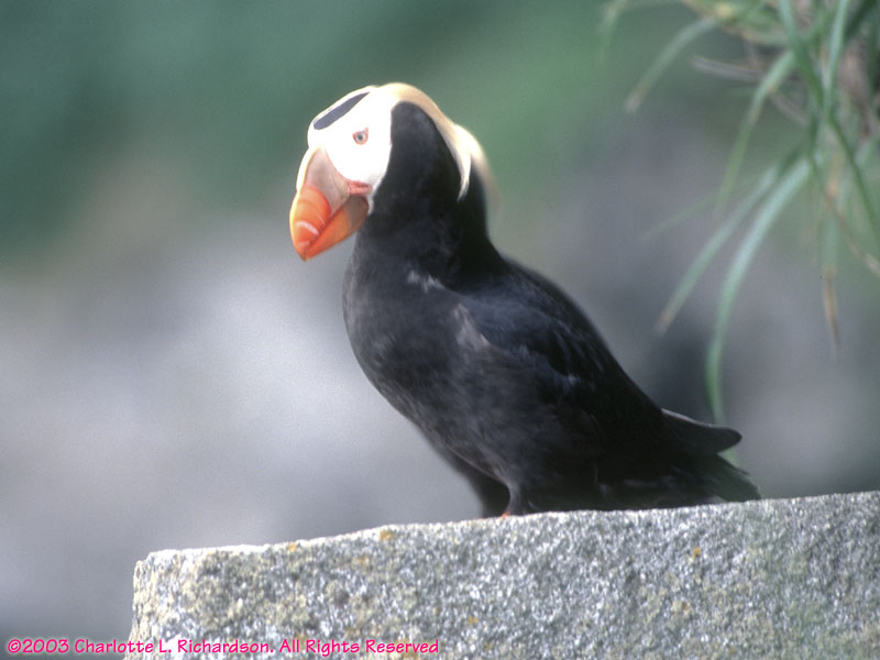 Tufted puffins, Fratercula cirrhata, nest in burrows at the top of cliffs.