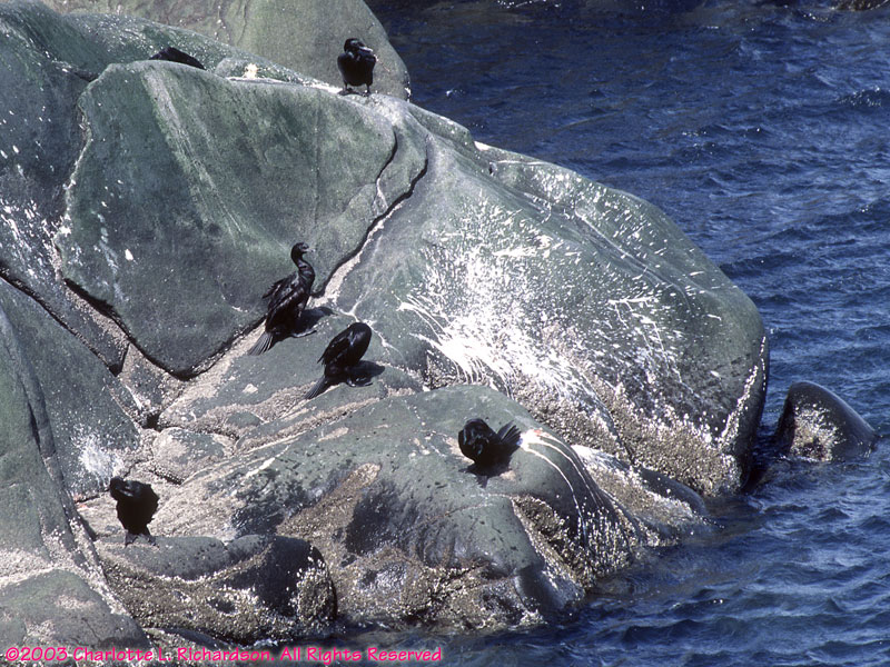 Double-crested cormorants, Phalacrocorax auritus, roost just above the waves.