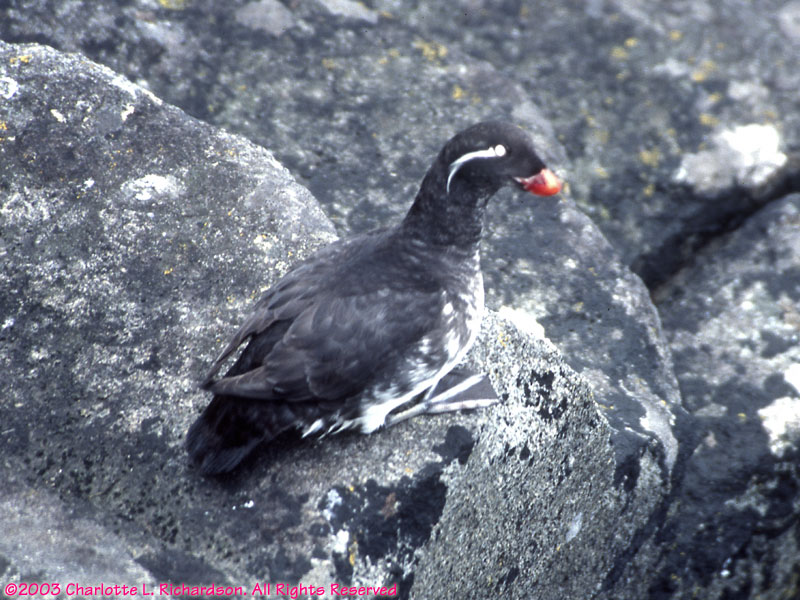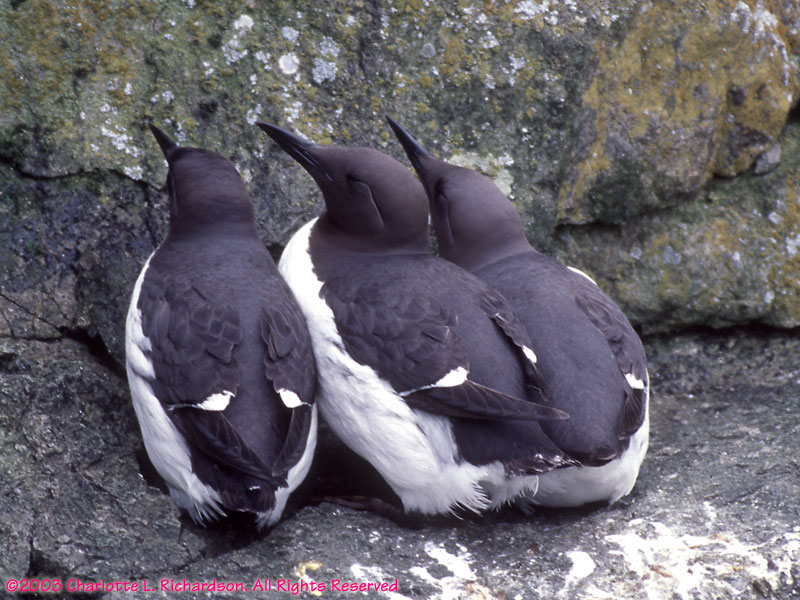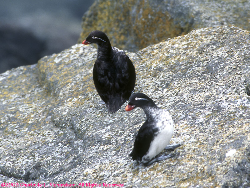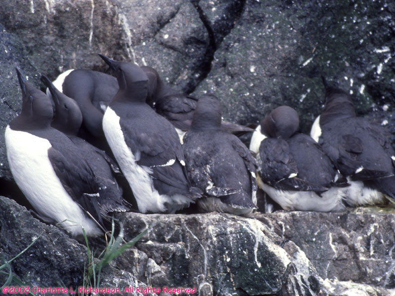 Common murres, Uria aalge, lay their sharp pointed eggs on bare rocks.