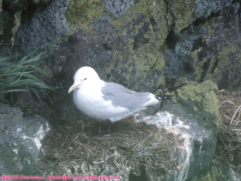 Black-legged kittiwakes, Rissa tridactyla, build nests of dead grasses.