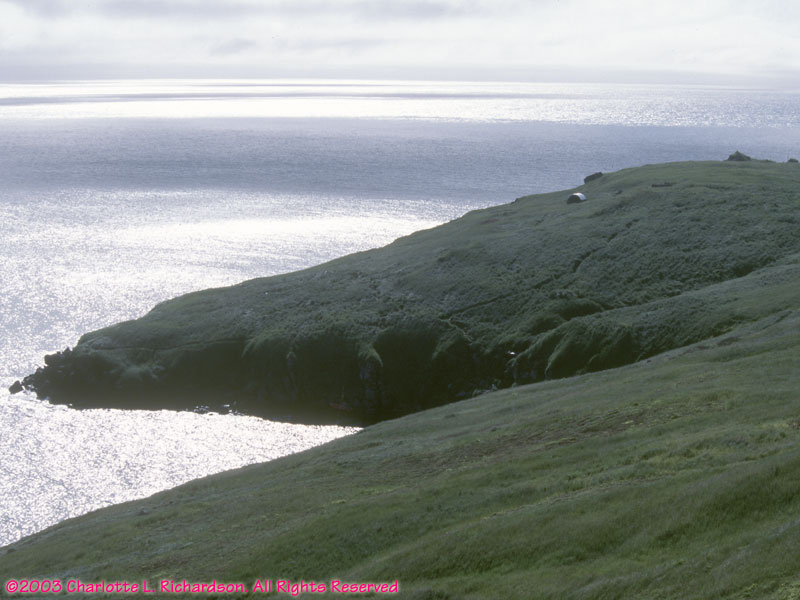 Visitors land at Boat Cove and scramble up the cliff with their gear. Low tundra vegetation covers the lower elevations of the island above the cliffs.