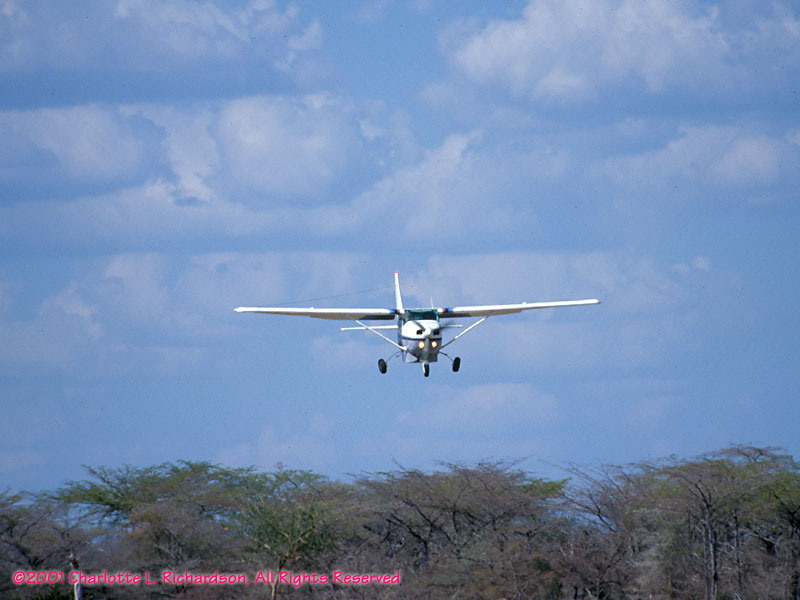 The only way to reach the camp is by small plane. Before the plane can land a park ranger chases the zebras away from the landing strip.