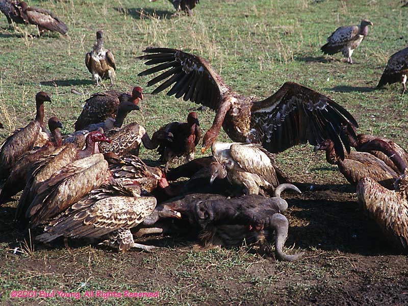 These vultures were feeding on a wildebeest. They are mostly Ruppell's griffon vultures. The picture does not convey the noise as the birds jostle for feeding position, nor the smell.