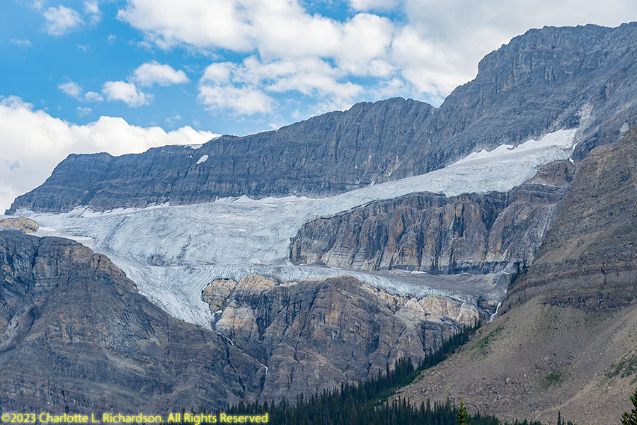 Crowfoot Glacier, on the northeast flank of Crowfoot Mountain, is part of the Wapta Icefield.