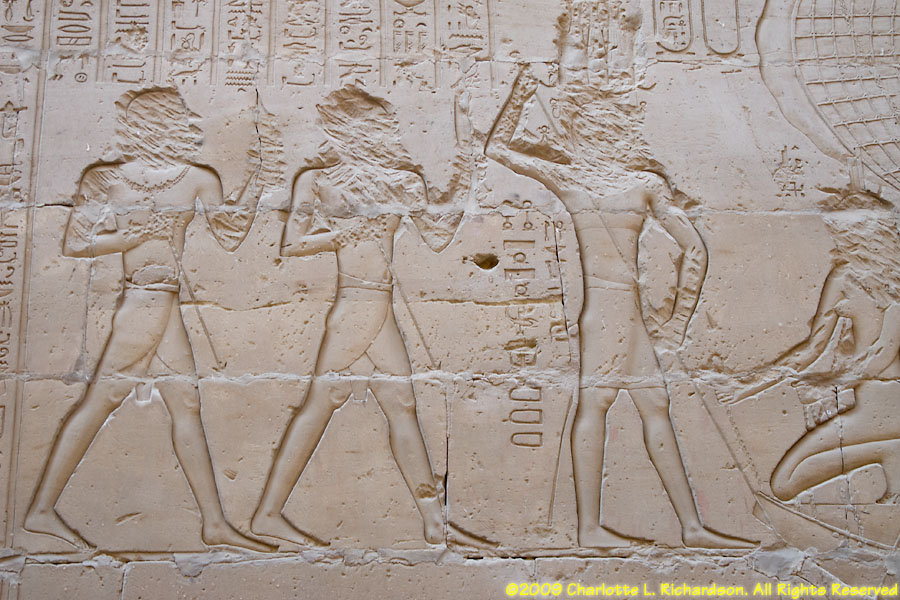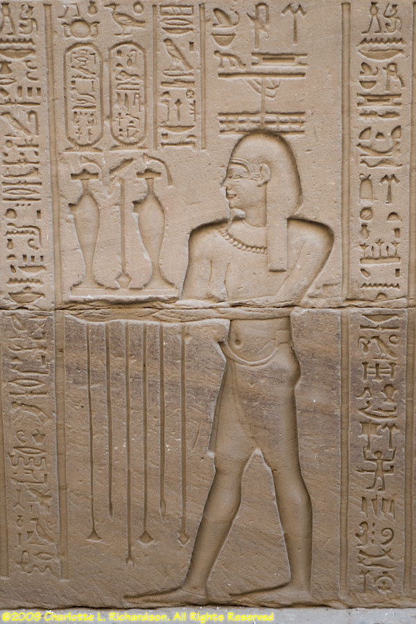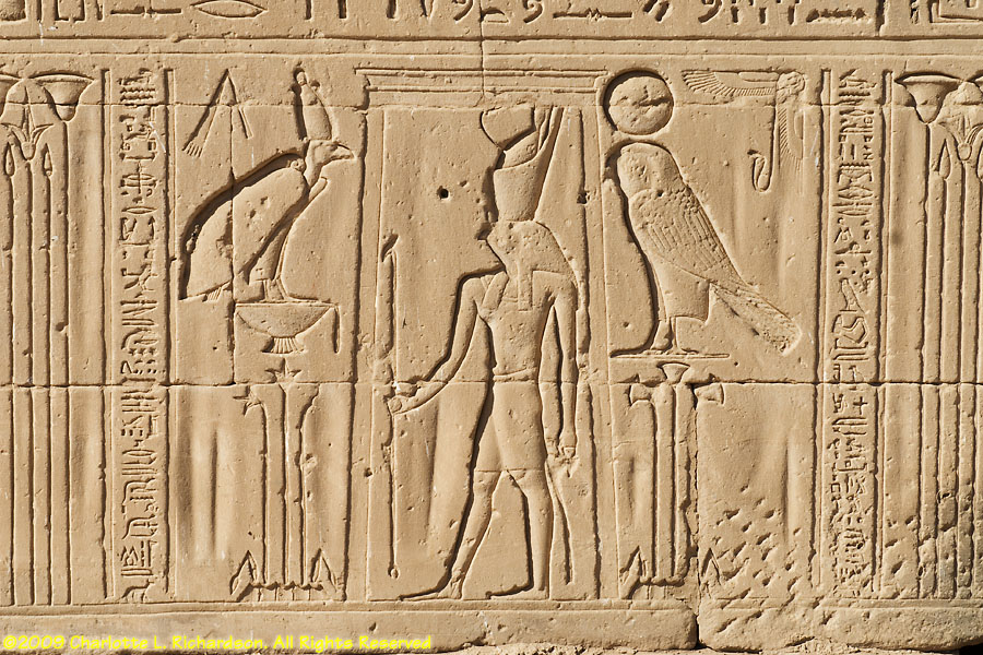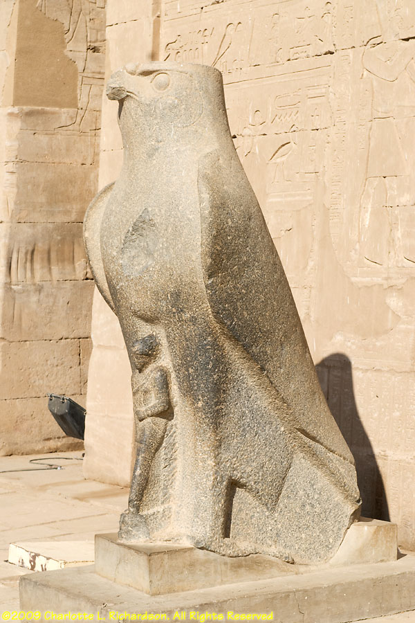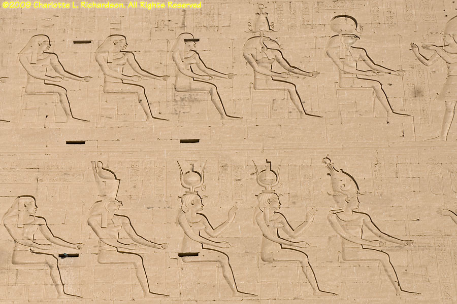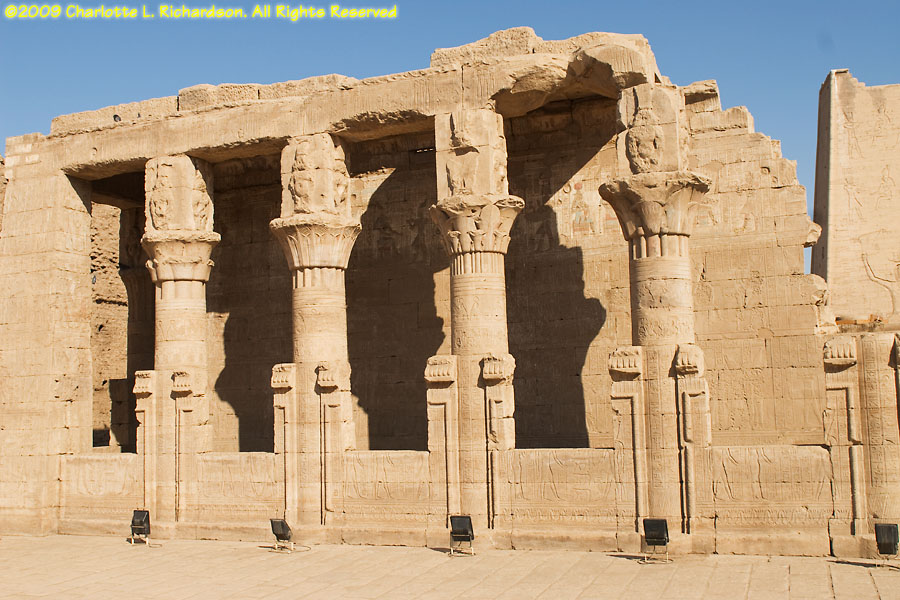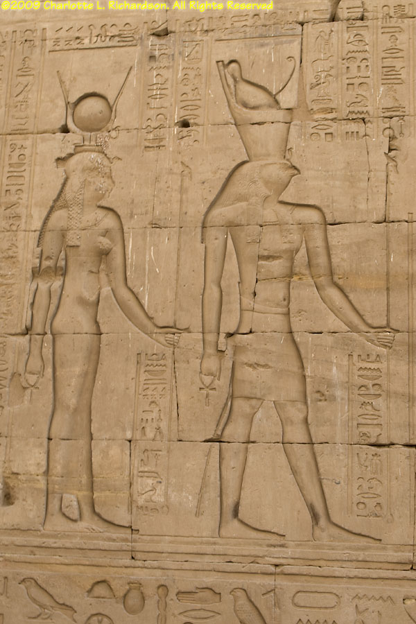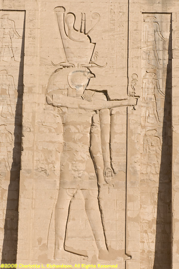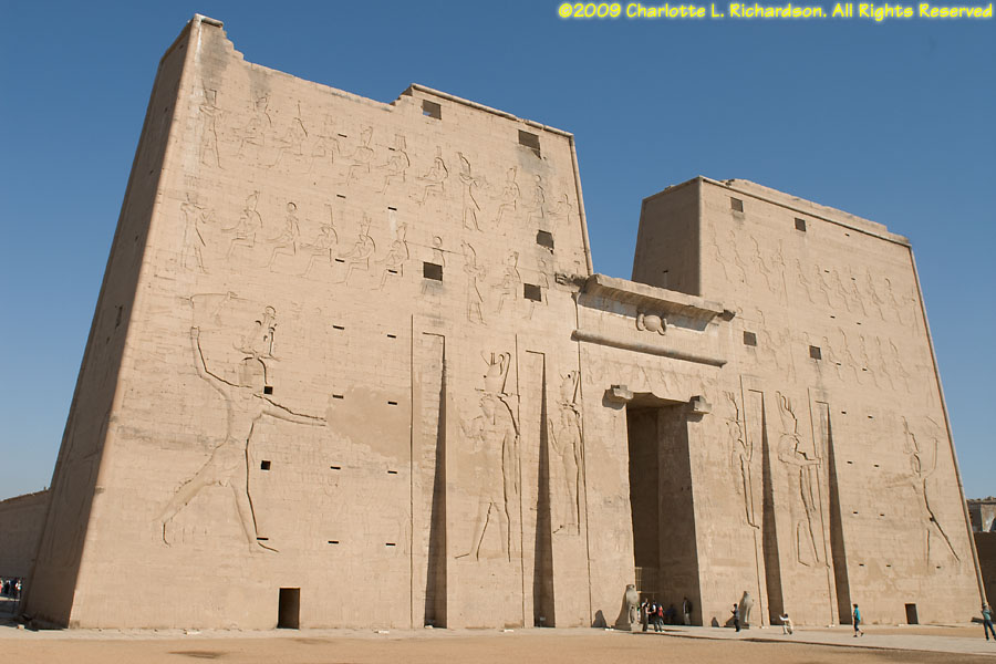 Edfu is halfway between Luxor and Aswan. Its temple of Horus is the largest and best-preserved Ptolemaic temple in Egypt. It was built by the Greeks in the early Egyptian style and completed in 51 B.C.E. The pylon shows scenes of pharaoh Ptolemy XII defeating his enemies.