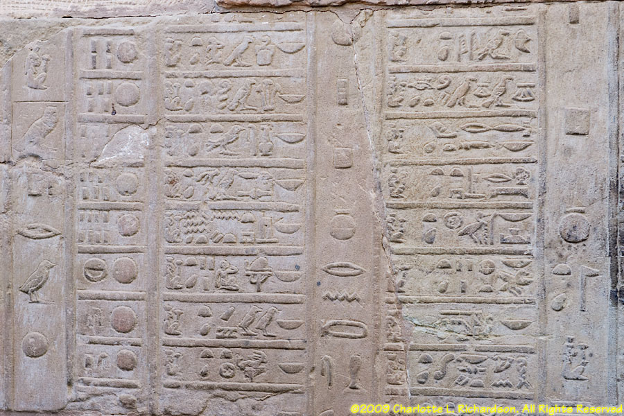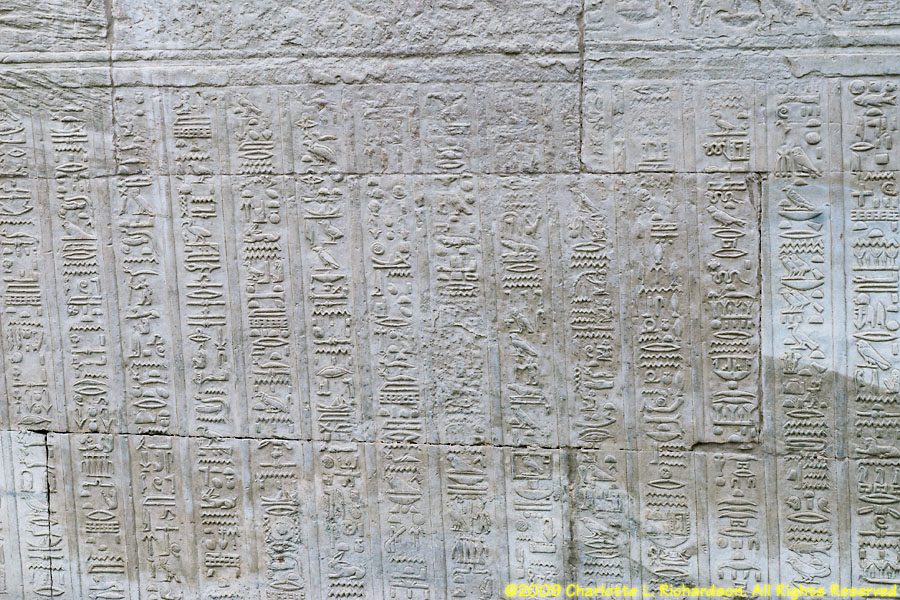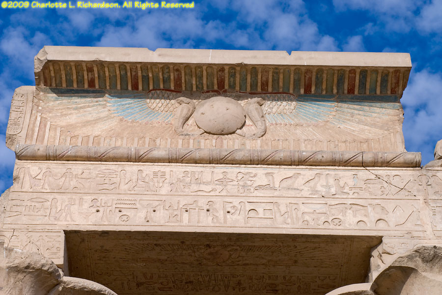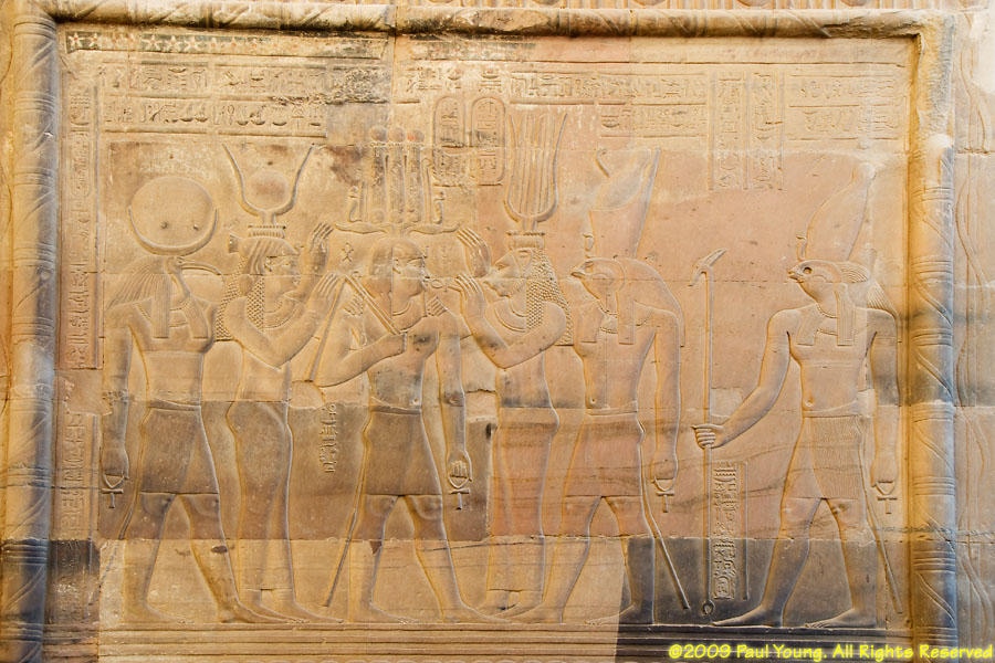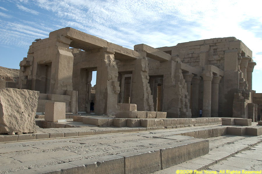 The Greco-Roman Temple of Kom Ombu is 40 km north of Aswan. It is two symmetrical temples side by side. The left side is the temple of the falcon god Horoeris (Horus the Elder). The right side is the temple of Sobek, the local crocodile god. This is one of the few temples still situated on the banks of the Nile. It was begun by Ptolemy VI in the second century B.C.E. and completed by Ptolemy XII in the first century B.C.E. Roman emperor Augustus added the entrance pylon in 30 B.C.E.