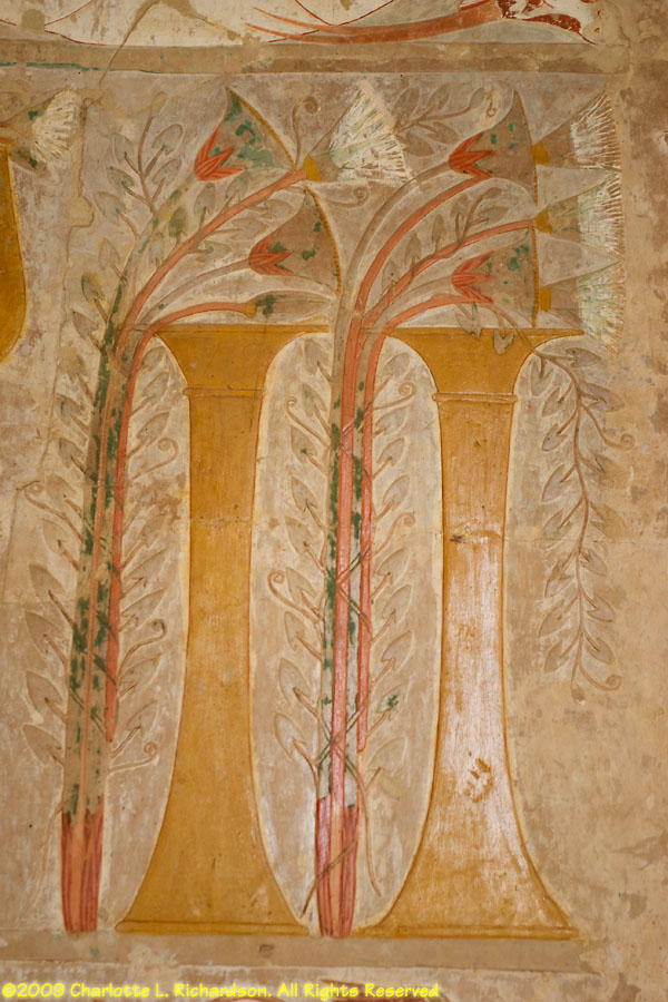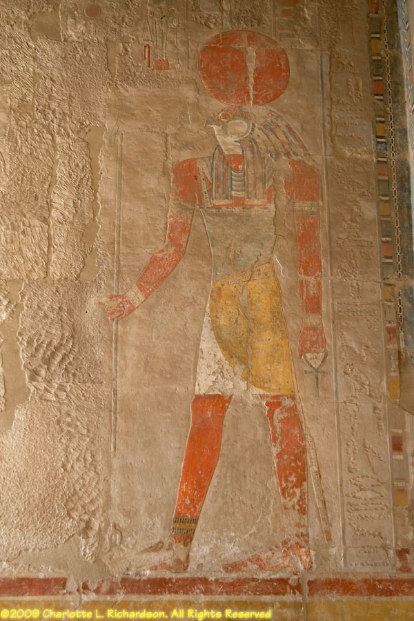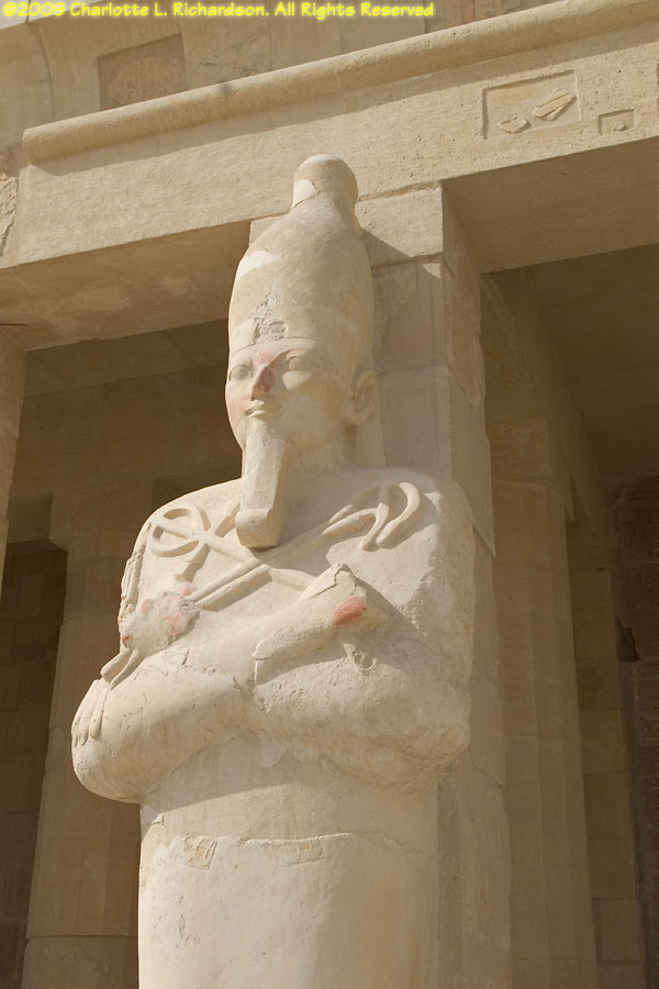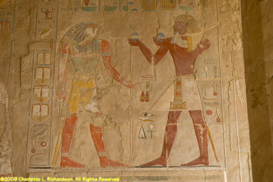 The mortuary temple of Queen Hatshepsut, Egypt's first female pharaoh, in Luxor at Deir al-Bahri is at the foot of a sheer limestone cliff. The pyramid-shaped mountain above the cliff gave the site royal appeal. Inside, the original pigments remain colorful in many of the paintings. An entire wall is devoted to paintings of her expedition to the land of Punt, apparently in the area of Ethiopia on the Red Sea, with her troops in sailing ships, recognizable tropical fish, and the queen of Punt. Hatshepsut lived from c. 1473 to 1458 B.C.E. and was the daughter of Thutmose I. When Thutmose I died, his son Thutmose II succeeded him and married his stepsister Hatshepsut. When Thutmose II died around 1479 B.C.E., his young son Thutmose III became pharaoh, with Hatshepsut as his regent. In 1473 B.C.E., she declared herself pharaoh. She wore a fake beard and male clothing and had herself drawn and treated as a man. She disappeared around 1458 B.C.E. when Thutmose III regained the throne. Next to Hatshepsut's Temple is the ruins of the Temple of Montuhotep II.