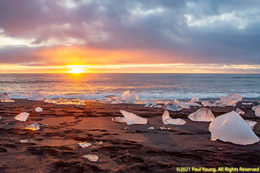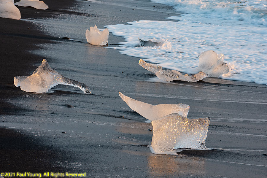 At the mouth of the Jokulsa River, Iceland's shortest, icebergs from Jokulsarlon wash up on the black sand Fellsfjara Beach, called "Diamond Beach".
