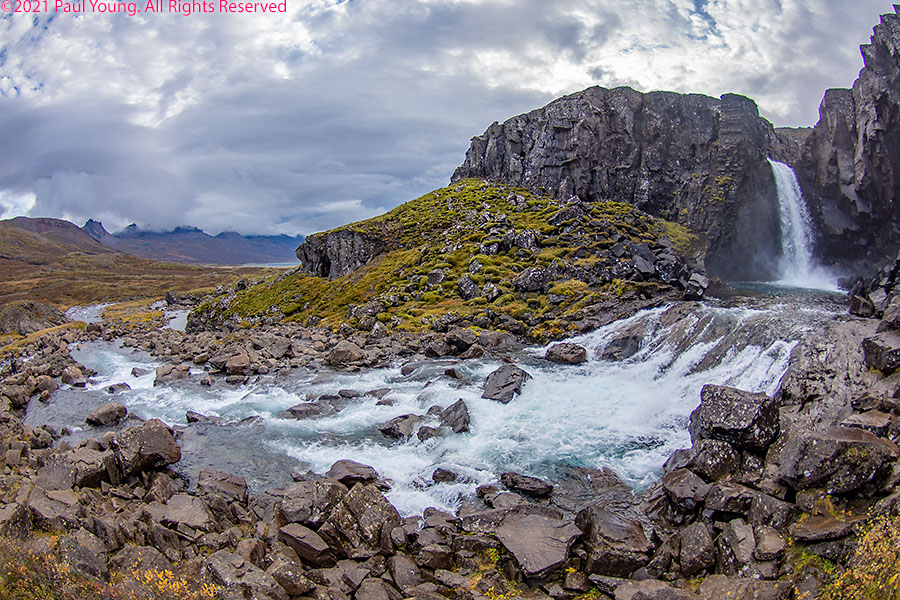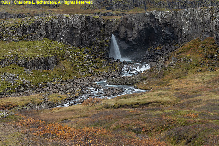 Folaldafoss is the lowest of a series of waterfalls along the Berufjarthara in the East Fjords area of Iceland. Its total height is 16m. The stream flows into the Berufjorthur.