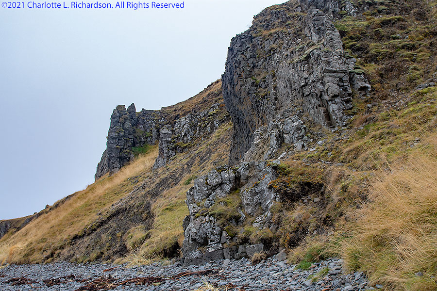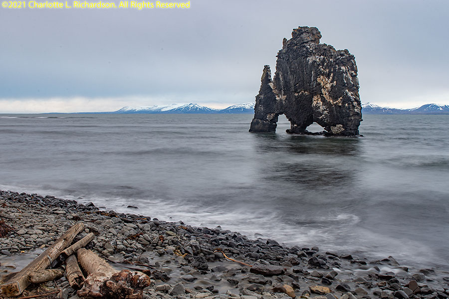 This 15m basalt sea stack is on the Vatnsnes Peninsula's east coast in Northwest Iceland. It is a volcanic basaltic plug. According to legend it was a troll caught by sunlight while attempting to destroy the monastery at Thingeyrar. The base of the sea stack has been reinforced with concrete to prevent collapse. Several bird species nest on the rock, producing the white guano streaks.