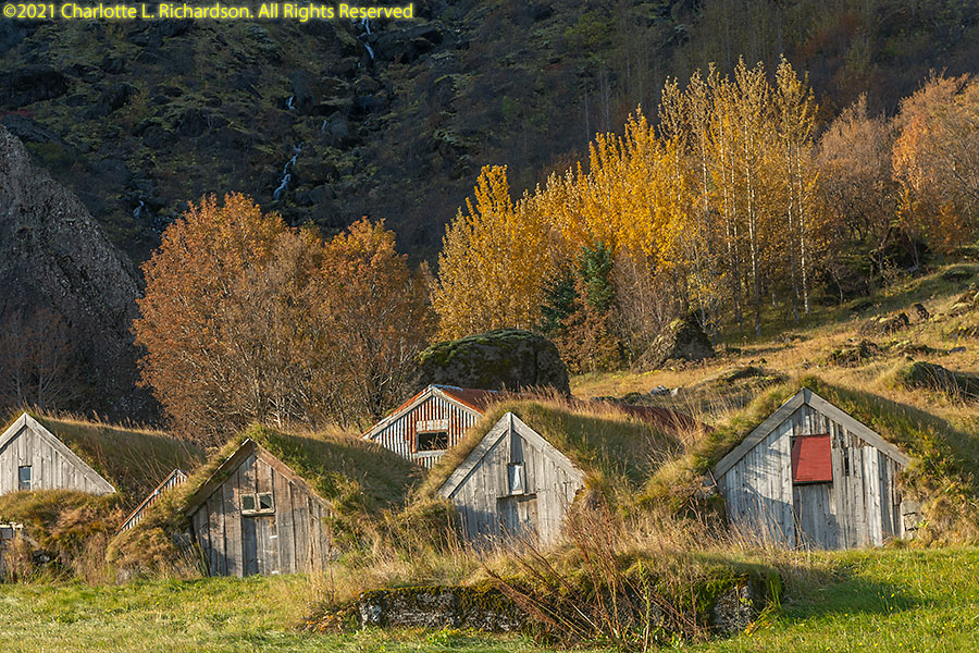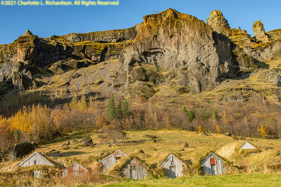 Lomagnupur towers over the turf-roofed farm at Nupsstathur. The buildings date back to the early 19th century. The turf chapel is one of the last turf churches in Iceland and was once a museum. It is the smallest turf-roofed church in Iceland.