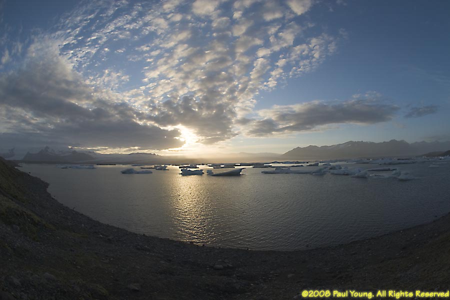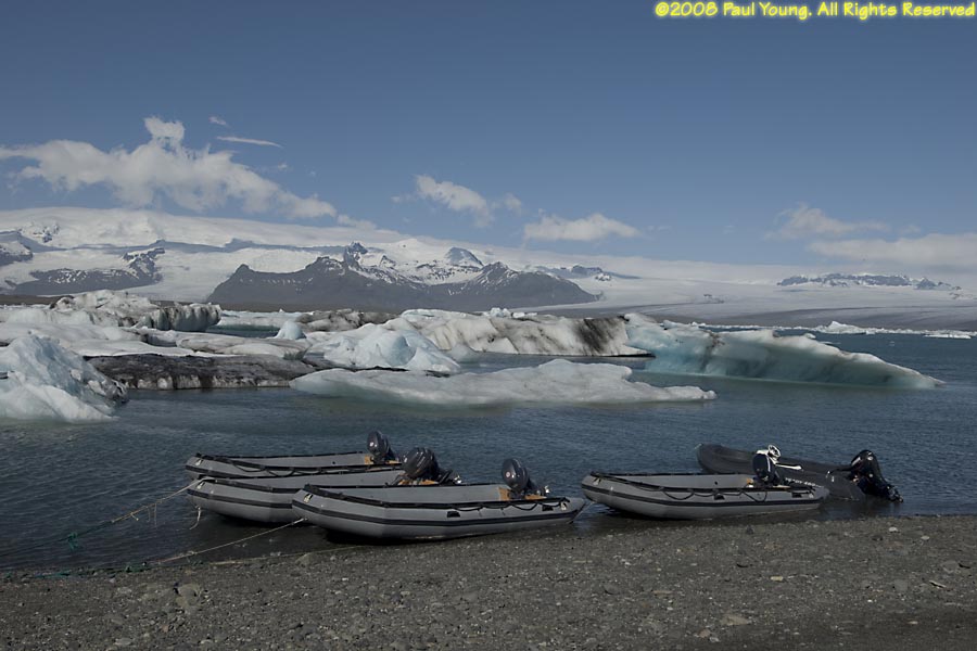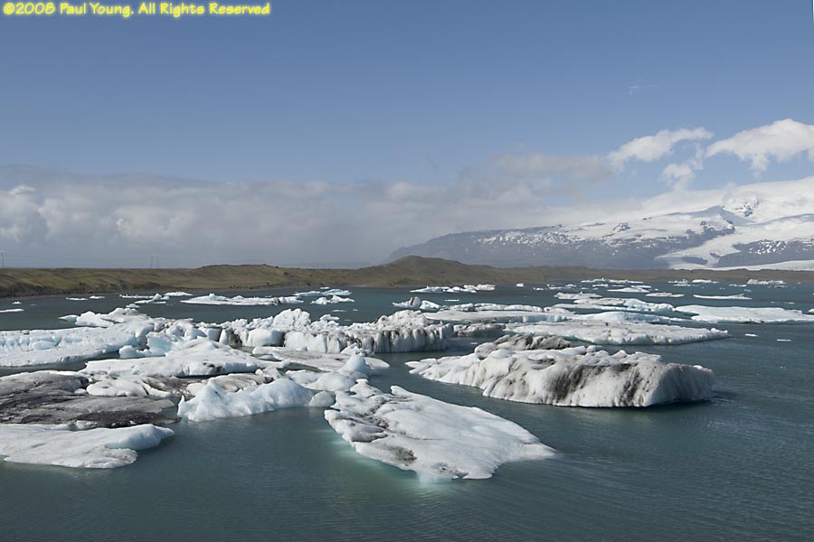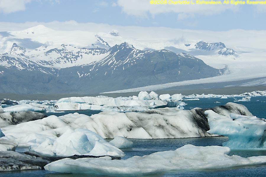 Jokulsarlon glacial lagoon, at the edge of Breidamerkurjokull glaicier, lies in the southeastern part of Iceland. The lagoon is only about one hundred years old, and is expanding so quickly that it threatens the Ring Road. The lagoon is the outer extent of a 20 km fjord extending inland under the glacier.