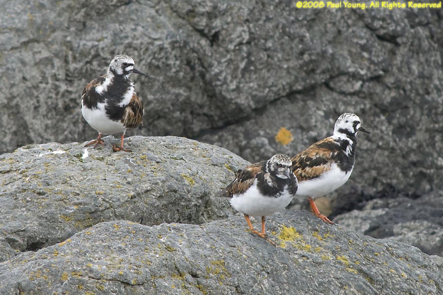 Turnstones (Arenaria interpres) are small lively shorebirds. They turn over seashore stones and seaweed in search of food.