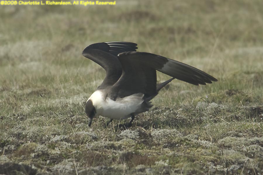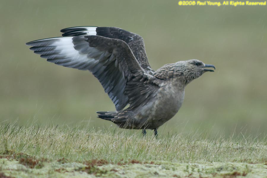 Great Skuas (Catharacta skua) are larger and more heavily built birds. They are agile and powerful fliers.