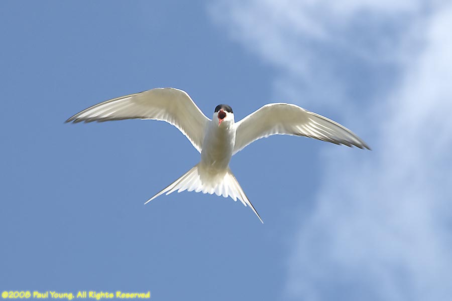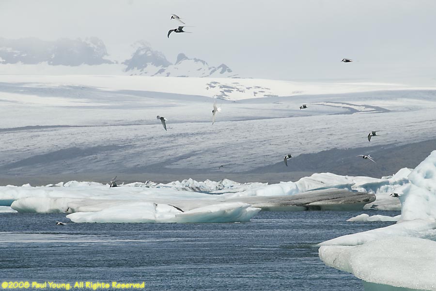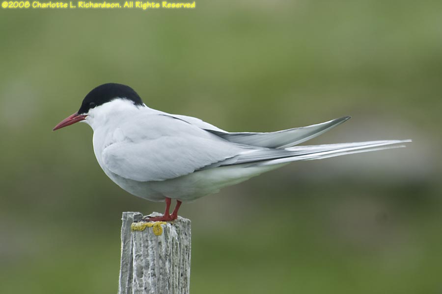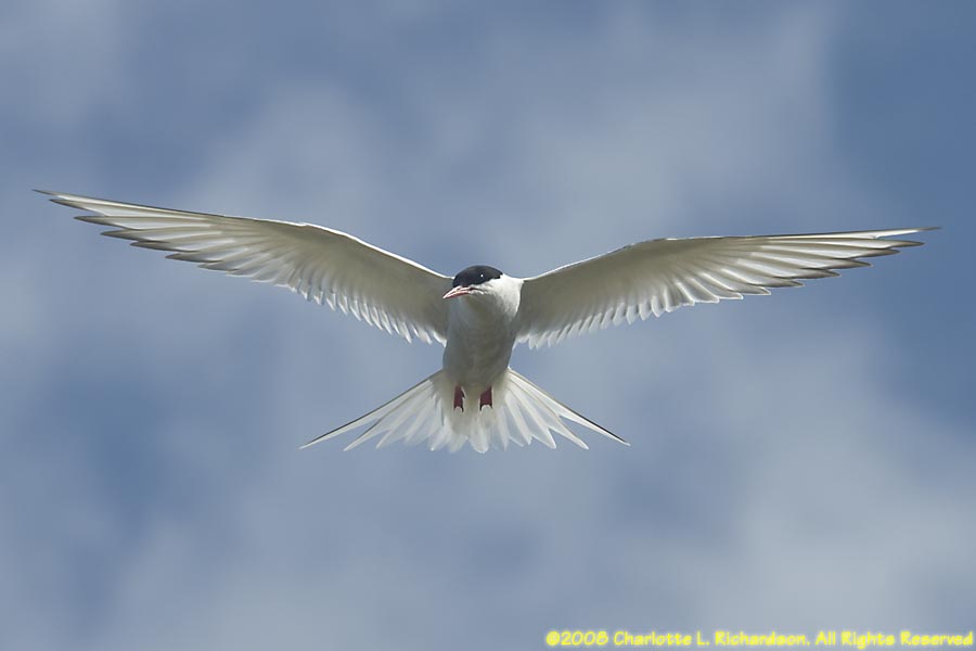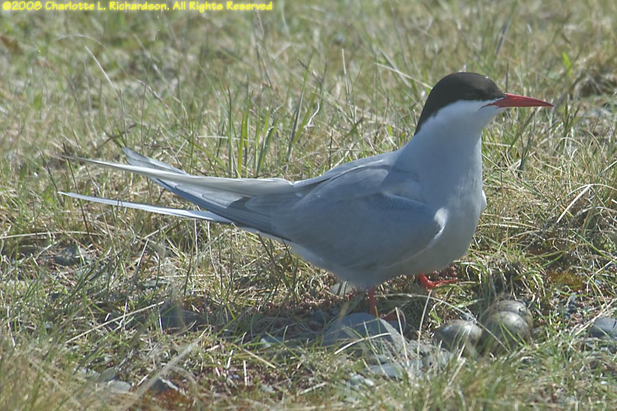 Arctic terns (Sterna paradisaea) are slender, elegant terns. The pesky birds aggressively defend their nesting areas - even if the photographer is a long ways from the nest site. They migrate to the Antarctic for the winter.