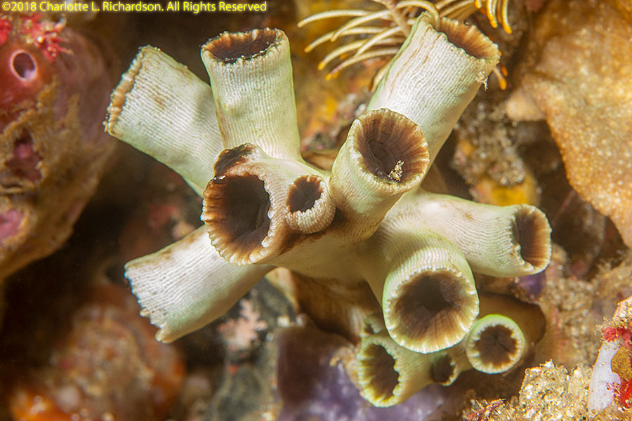 Sea pens are colonial marine cnidarians. The individual polyps each have eight tentacles, but are specialized. One polyp develops into a rigid erect stalk (called the rachis) and loses its tentacles. Other polyps form branches, water intake structures, feeding structures, and reproductive structures.