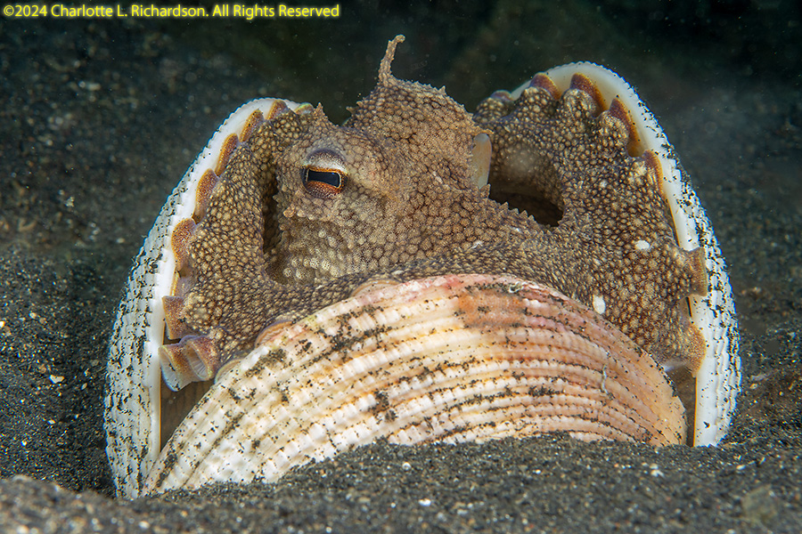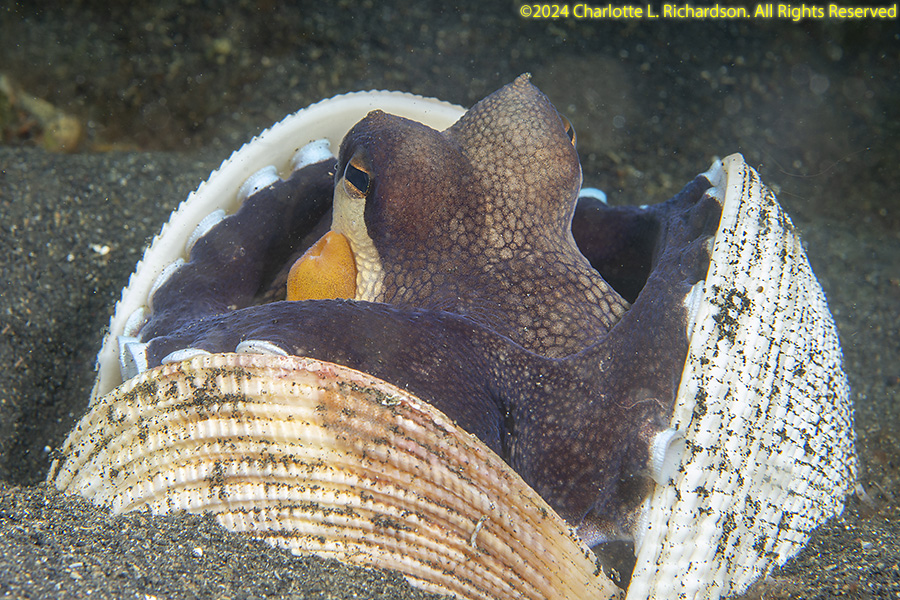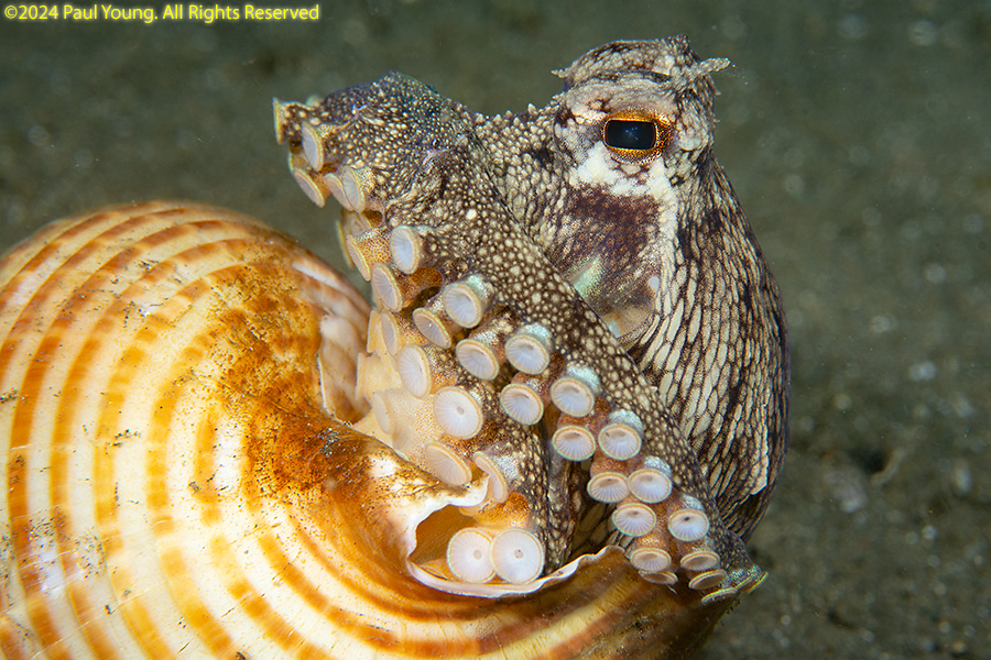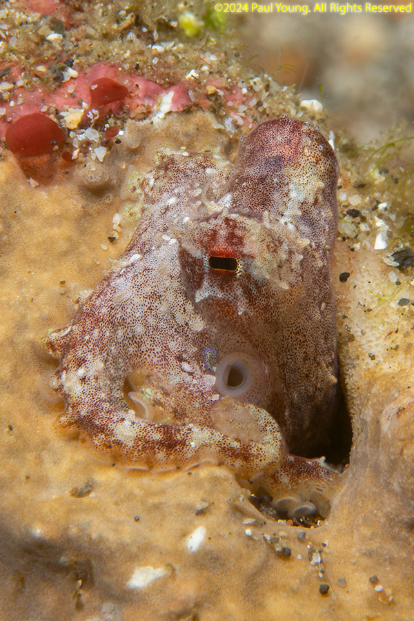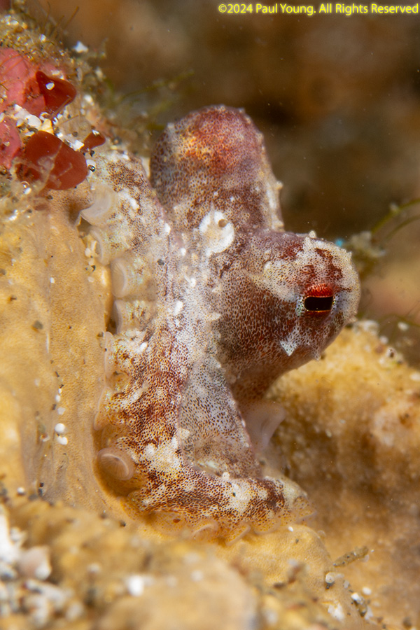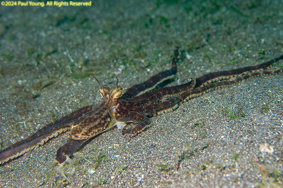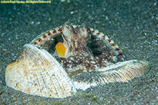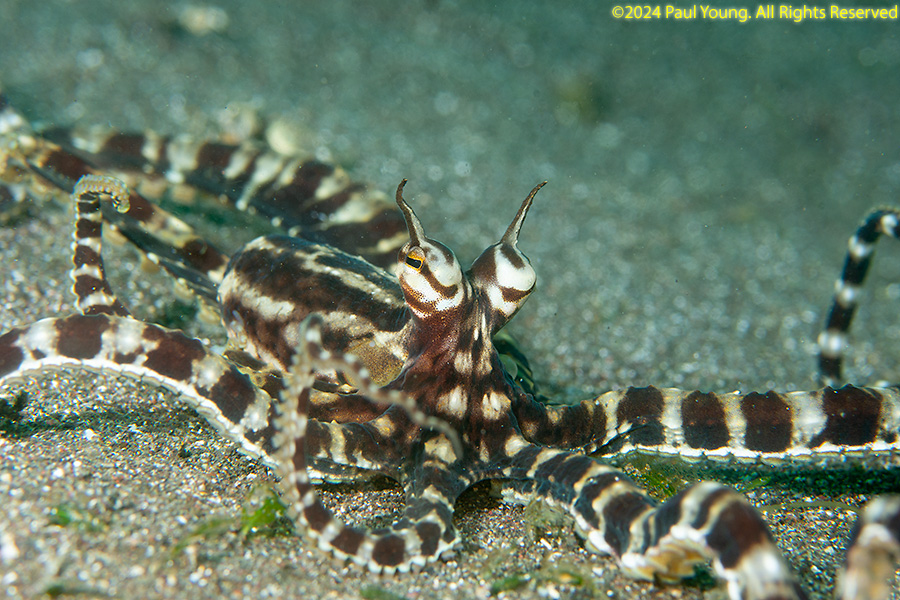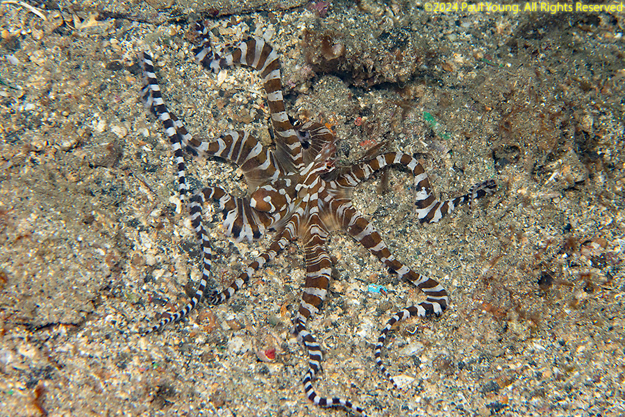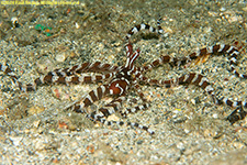 The mimic and wunderpus octopuses are very similar. You can distinguish them because the mimic octopus has a white line under its arms which the wunderpus lacks.