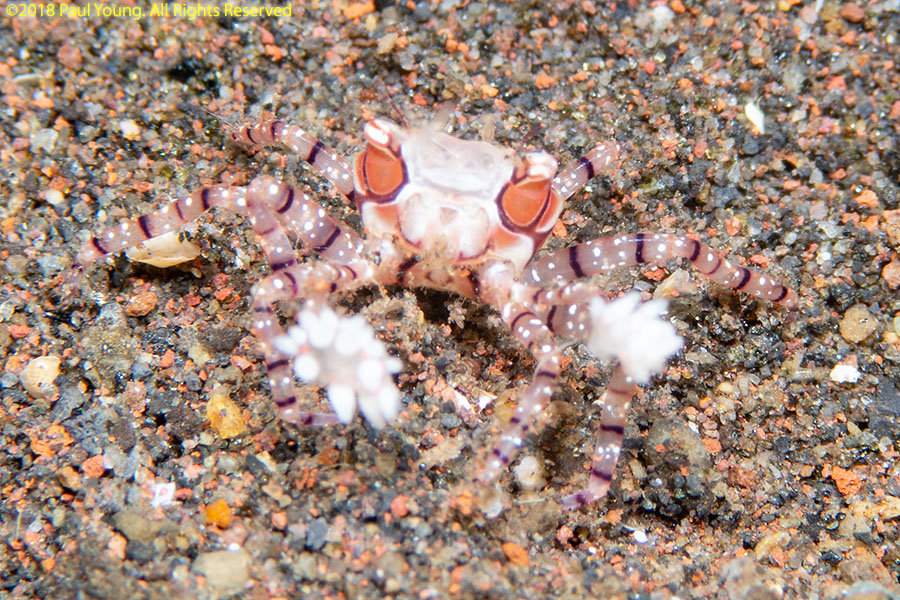 Porcelain crabs look much like true crabs, but appear to have only three pairs of walking legs. The last pair of legs is greatly reduced and hidden beneath the carapace. Their flexible, crab-like abdomen is not as compact as true crabs, and is kept tucked under the body. Unlike true crabs they have a long pair of antennae.